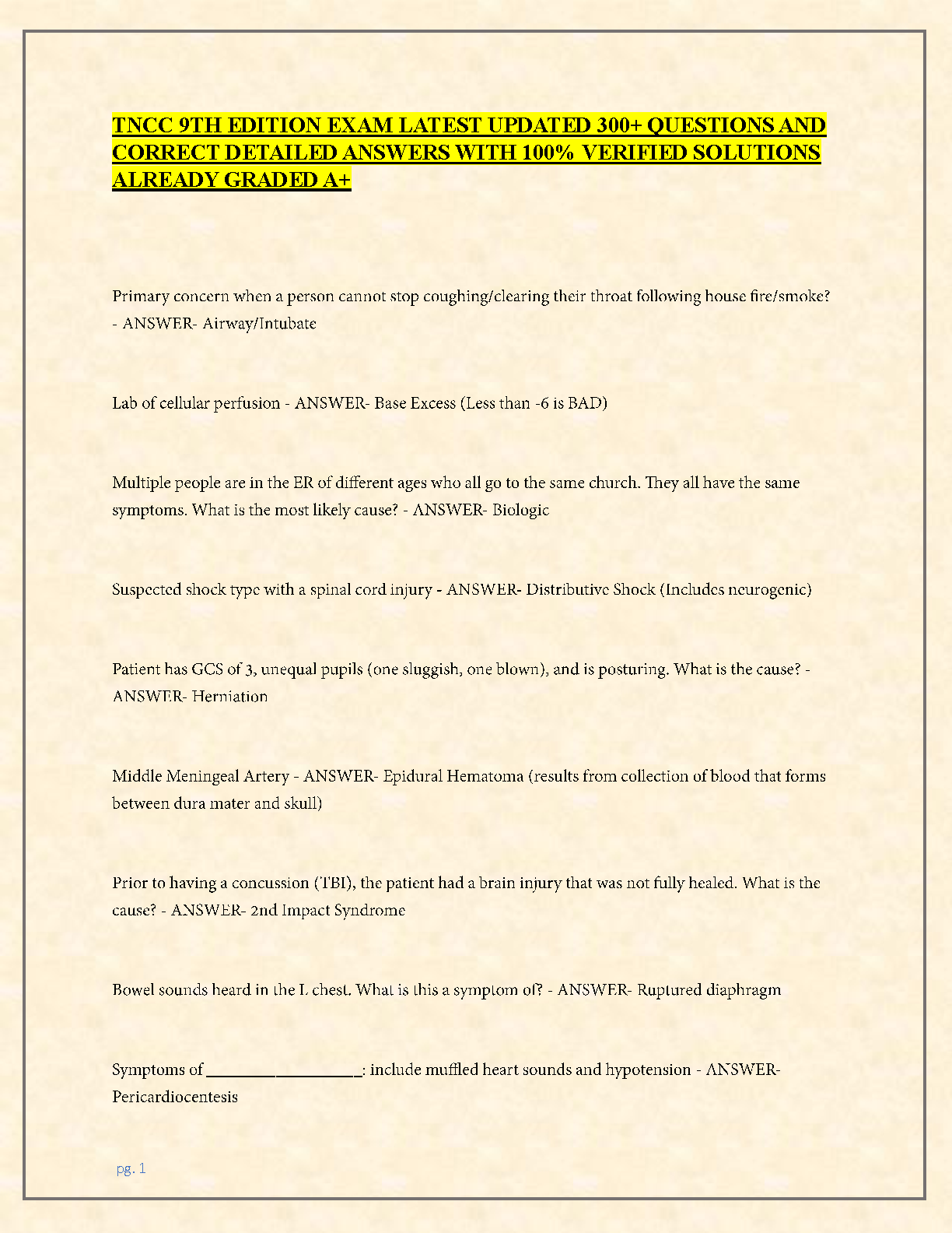 TNCC 9th Edition Exam Latest Updated 300+ Questions and Correct Detailed Answers with 100% Verified Solutions Already Graded A+