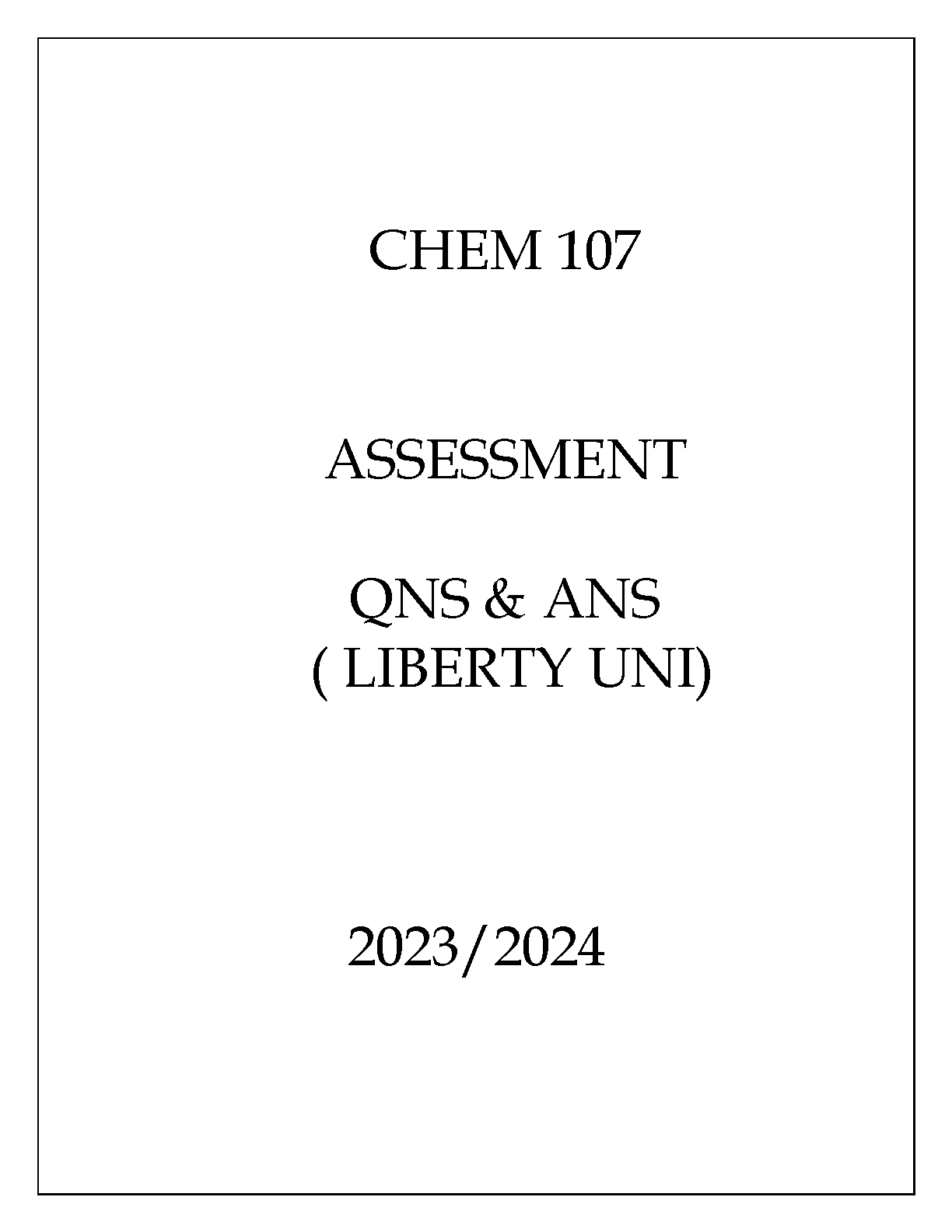 Ace your CHEM 107 exam at Liberty University with this comprehensive set of assessment questions and answers, carefully curated for the 2023/2024 academic year. Get a head start on your studies and boost your exam confidence with this invaluable resource designed to help you achieve a top grade on your first attempt.