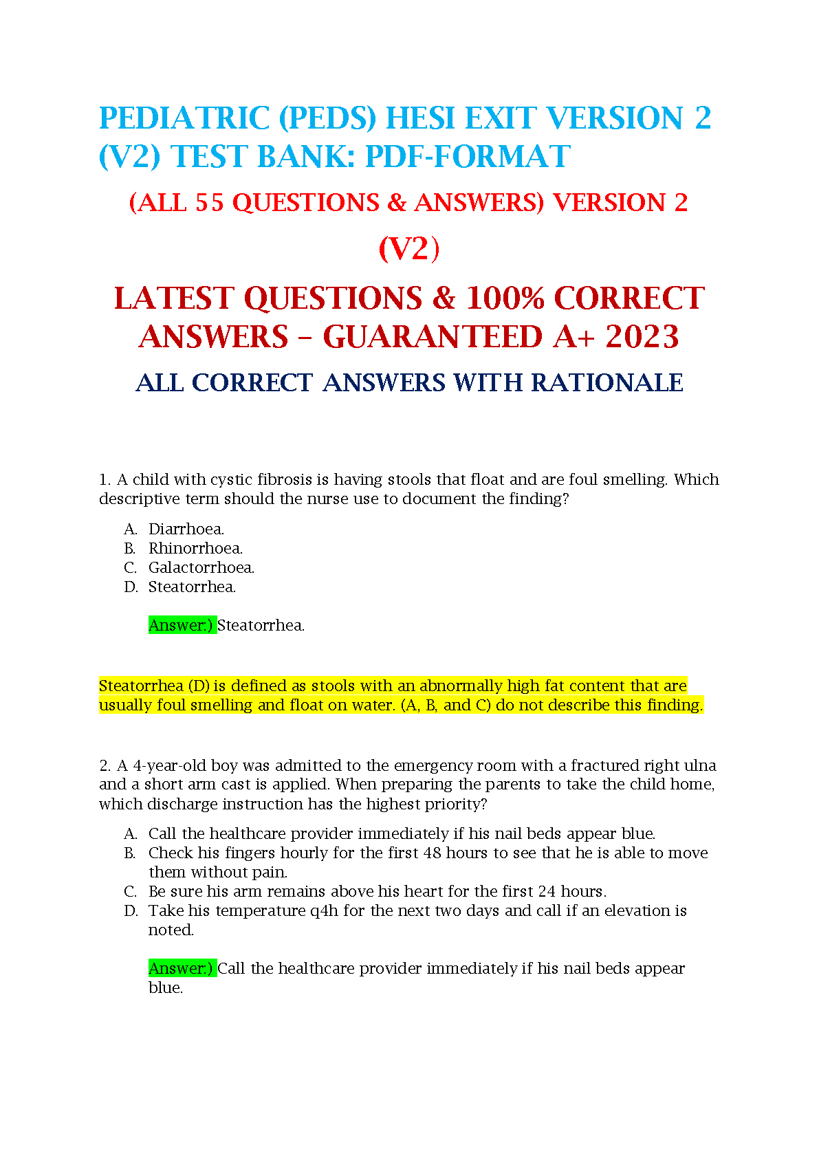 Pediatric (PEDS) HESI Exit Version 2 (V2) Test Bank: PDF-Format - All 55 Questions & Answers by HESI