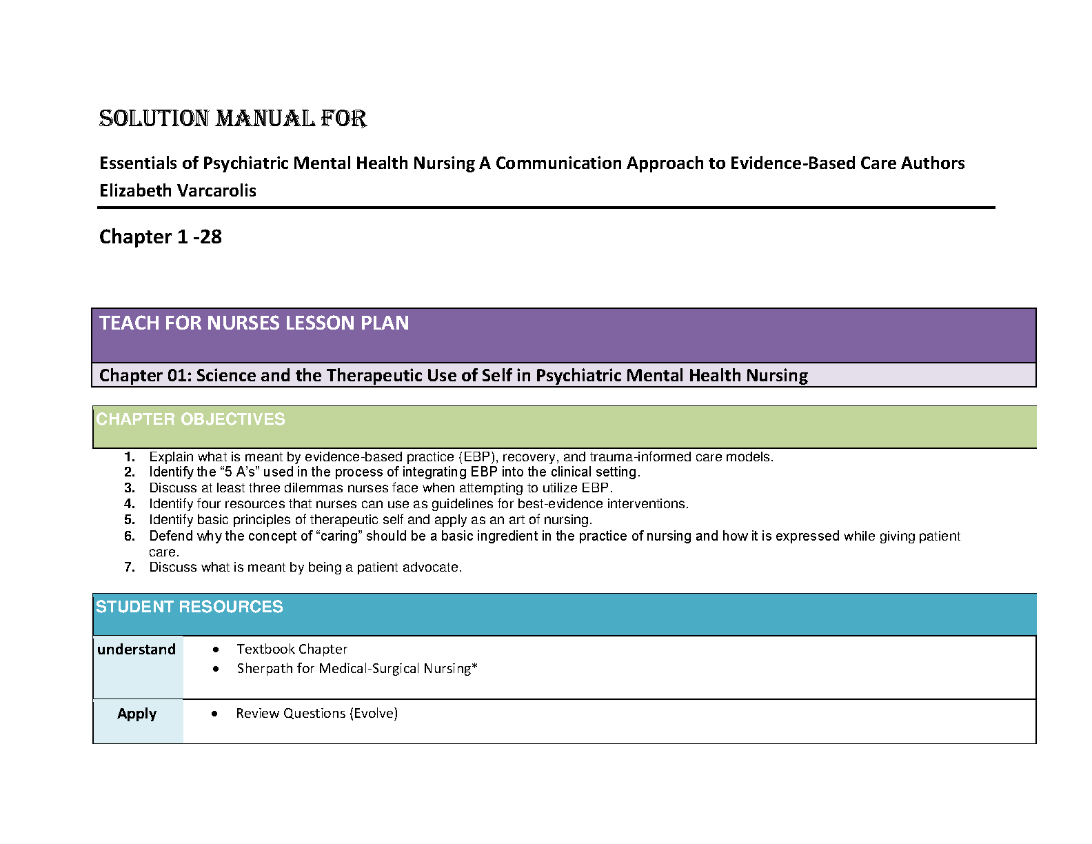 This comprehensive solution manual for "Essentials of Psychiatric Mental Health Nursing: A Communication Approach to Evidence-Based Care, 1st Edition" by Elizabeth Varcarolis is designed to help students excel in their psychiatric mental health nursing courses. It provides detailed answers to all questions and exercises in the textbook, making it an invaluable resource for understanding key concepts and applying them in real-world clinical settings.