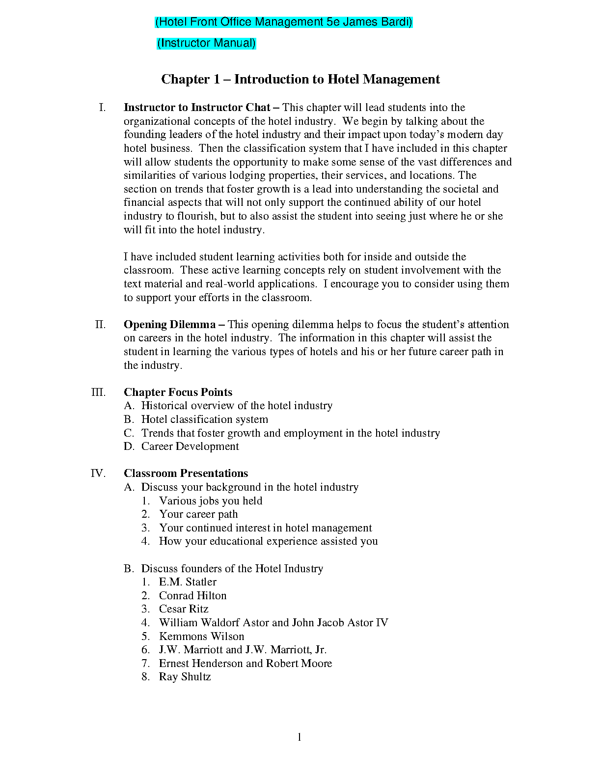 Hotel Front Office Management 5e - James Bardi, John Walker, and Joseph C. Enz - Introduction to Hotel Management