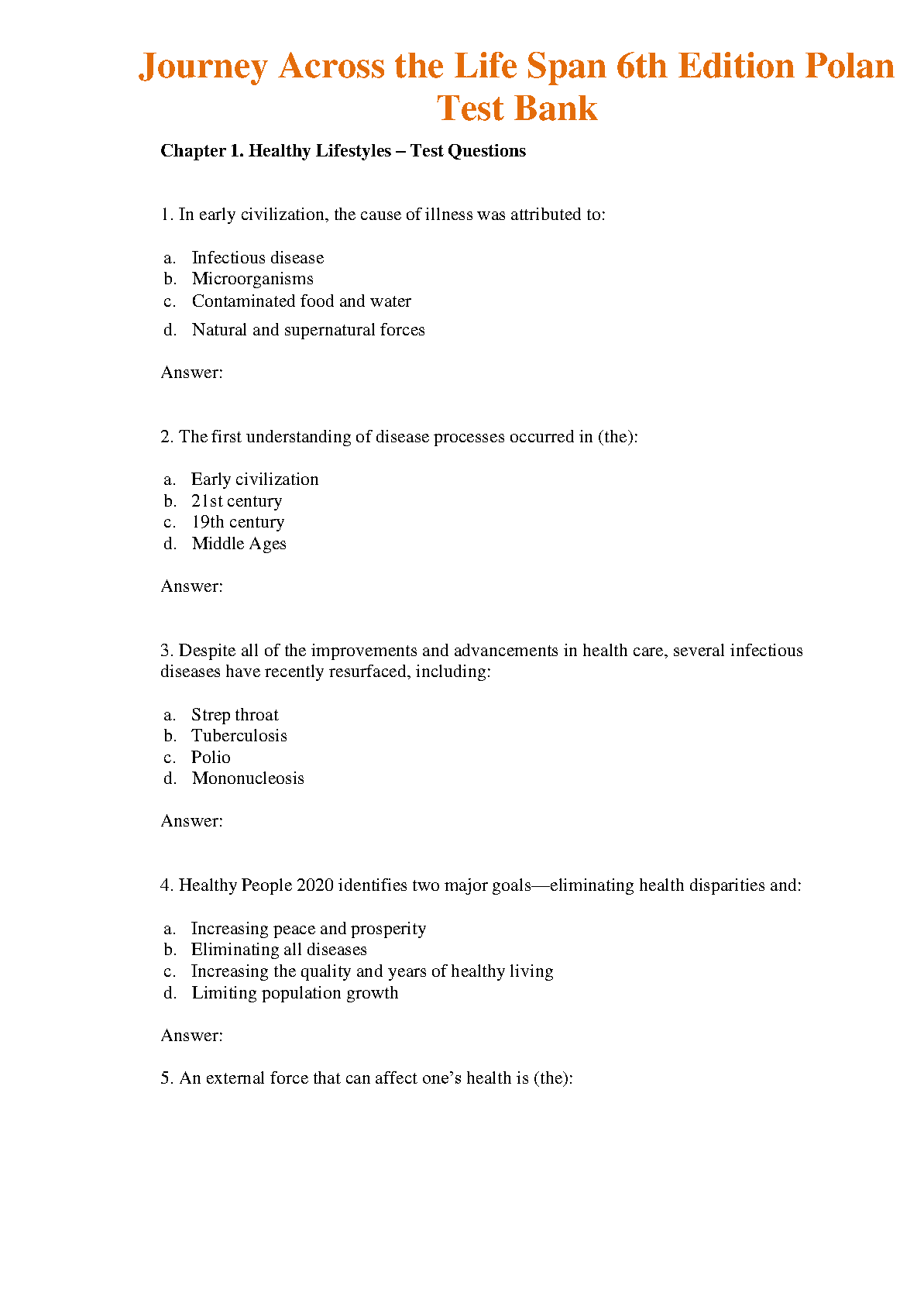 Journey Across the Life Span 6th Edition Test Bank by Barbara Polan, Mary Anne H. Hockenberry, Penny T. Wilson, and Patricia J. Harris provides comprehensive coverage of the lifespan from conception through death. The test bank contains a variety of question formats, including multiple-choice, true/false, fill-in-the-blank, and short answer. It is an excellent resource for instructors who are looking for a way to assess student learning.