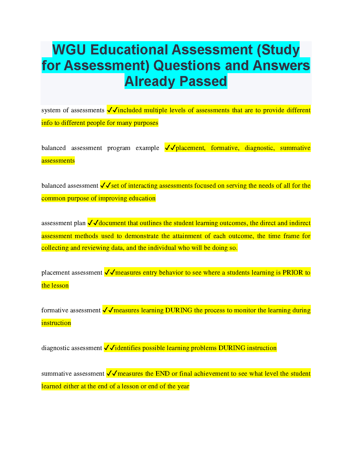 WGU Educational Assessment (Study for Assessment) Questions and Answers - Latest Edition for 2024/2025
