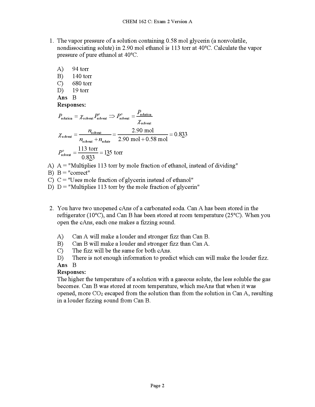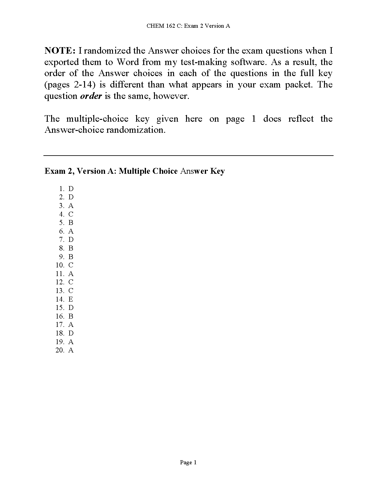 CHEM 162 Exam 2 Version A Multiple Choice Answer Key - 2024/2025 Edition