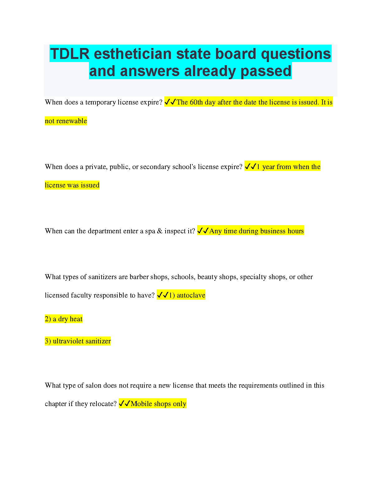 Esthetician State Board Exam Questions and Answers: 2024/2025 Edition - Pass on the First Attempt