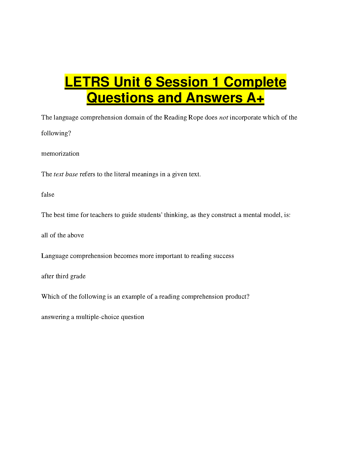 Ace your LETRS course with this comprehensive set of answers to Unit 6 Session 1 questions. This resource is perfect for students aiming to pass their exams on the first attempt, avoiding resits. Download and unlock the key to success.