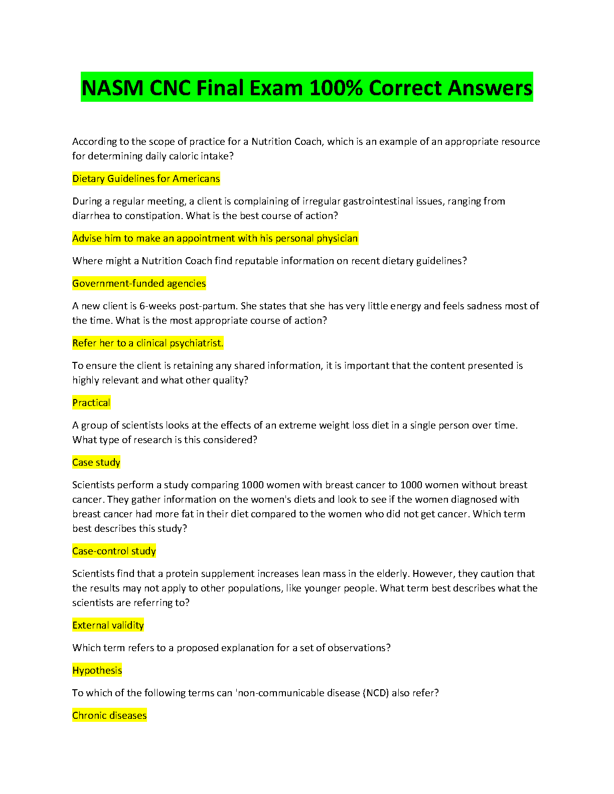 Ace your NASM CNC Final Exam with this comprehensive study guide featuring 100% correct answers. Gain a deep understanding of key concepts, practice scenarios, and exam-like questions. Developed by experienced instructors, this resource is designed to help you pass your NASM CNC exam on the first try.