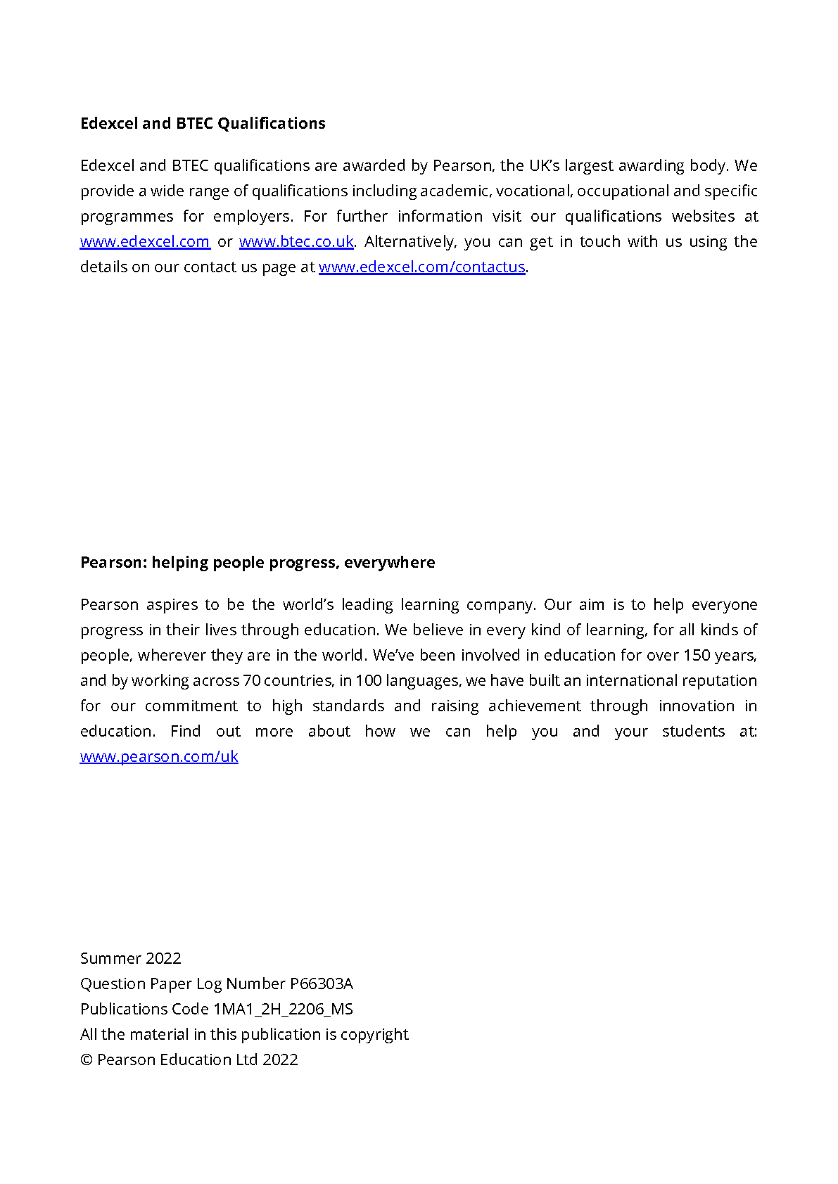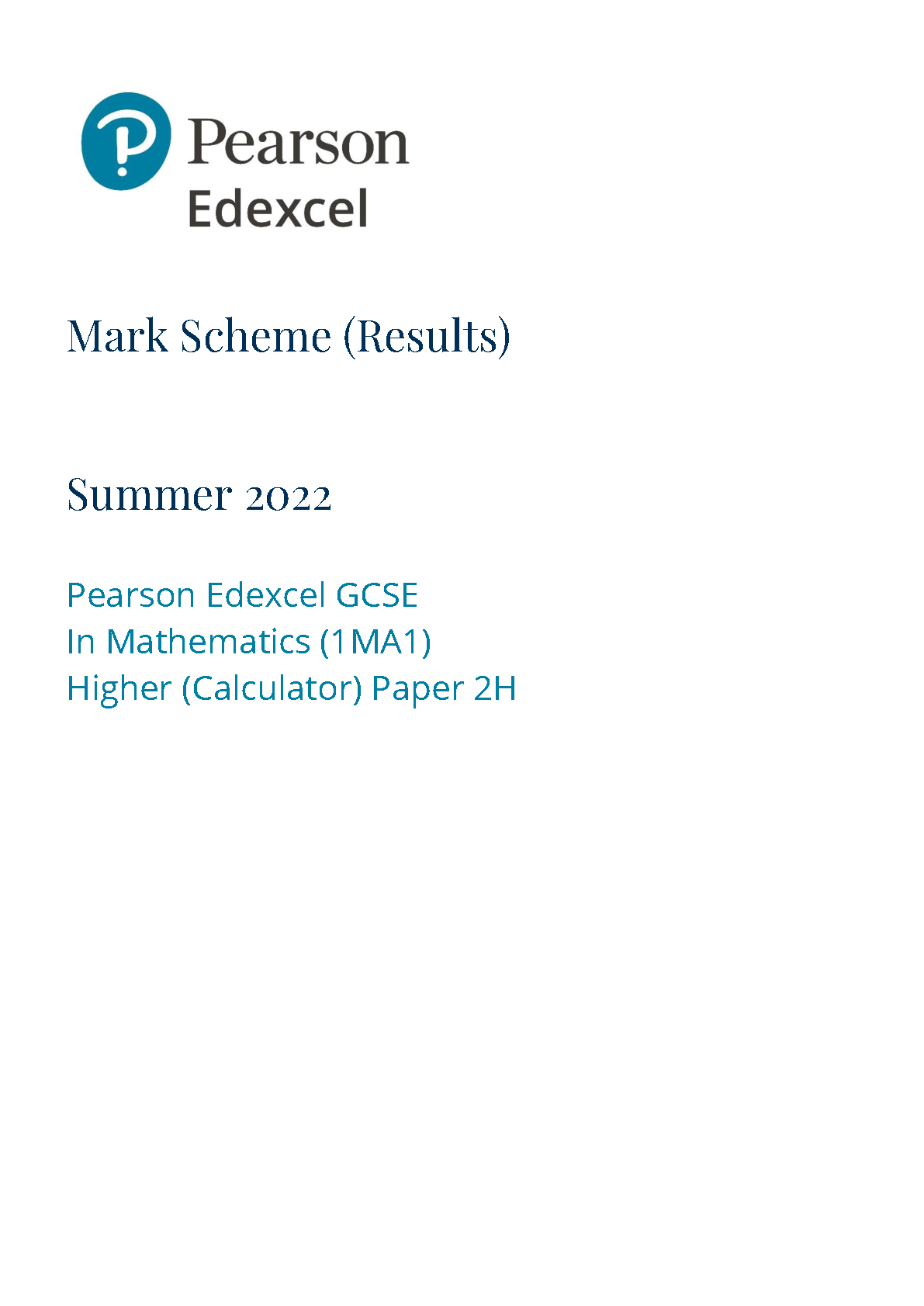 Pearson Edexcel GCSE in Mathematics (1MA1) Higher (Calculator) Paper 2H Mark Scheme - Summer 2022 Edition