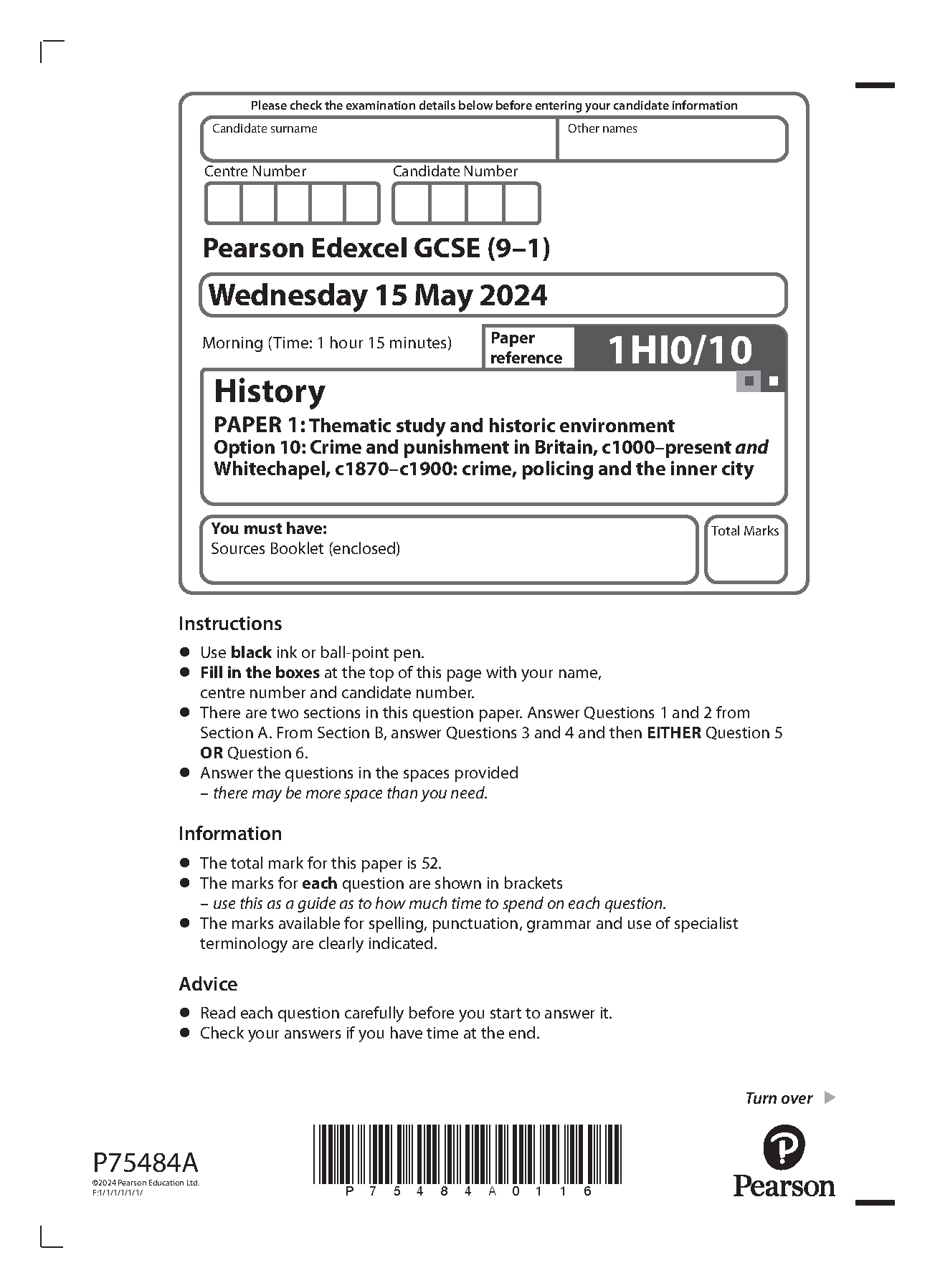 PEARSON EDEXCEL GCSE HISTORY QUESTION PAPER 1 2024 (1HI0/10:Thematic study and historic environment Option 10: Crime and punishment in Britain, c1000–present and Whitechapel, c1870–c1900: crime, policing and the inner city). DOWNLOAD THE OFFICIAL AND VERIFIED ON www.hackedexams.com INSTANTLY