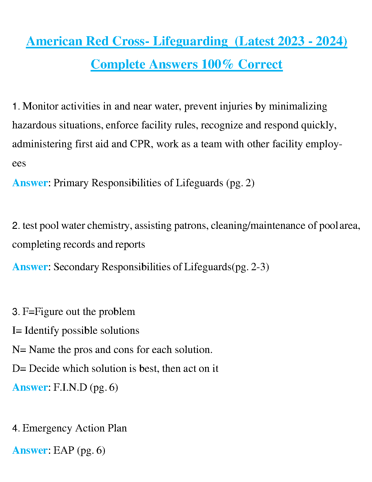 Ace your American Red Cross Lifeguarding exam on the first try with our comprehensive solution manual. This resource includes detailed answers to all practice questions, ensuring you're well-prepared for success.
