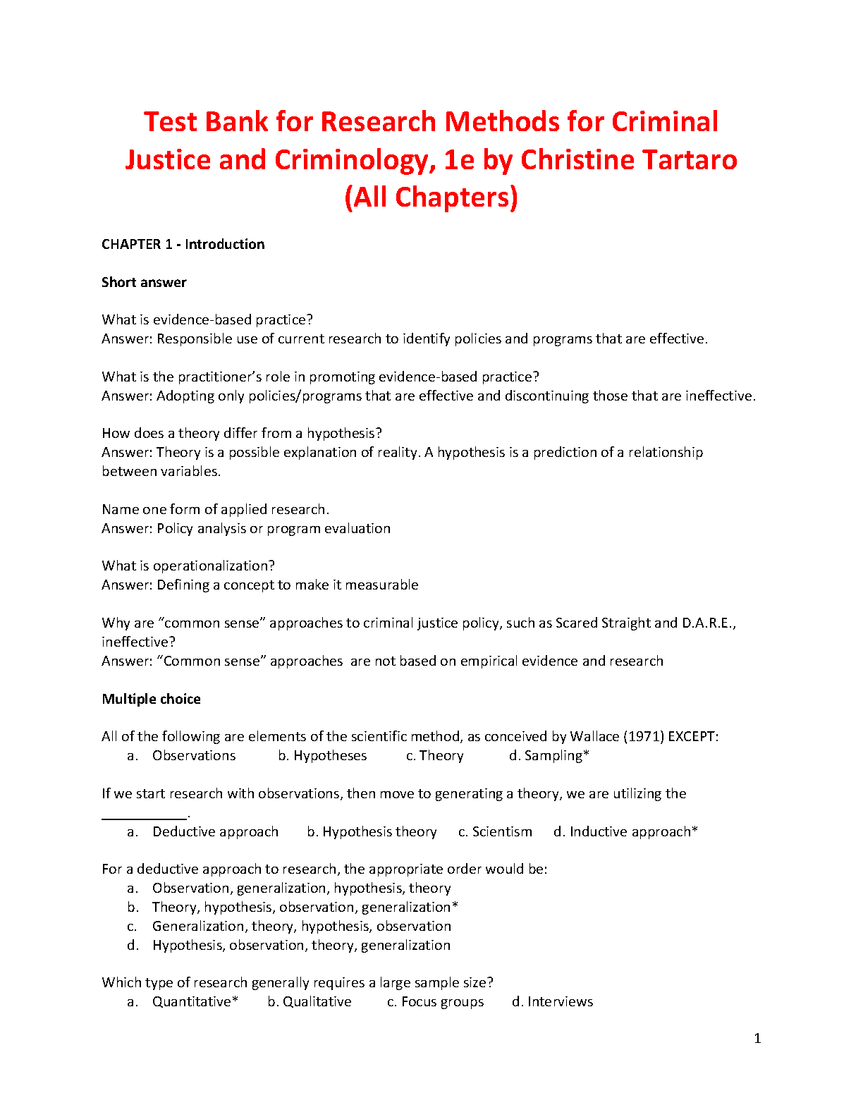 Test Bank for Research Methods for Criminal Justice and Criminology, 1e by Christine Tartaro