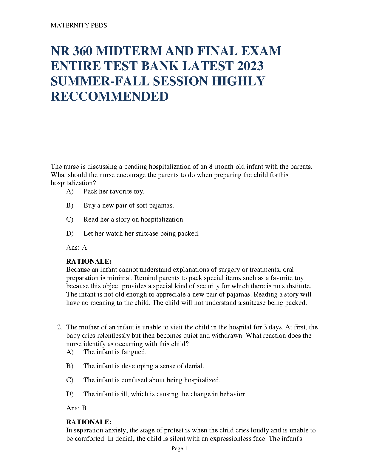 Ace your NR 360 Midterm and Final Exam with this comprehensive test bank. This resource contains the latest questions and answers covering all topics for the Summer-Fall 2023 session. Our study guide is designed to help students understand the concepts, practice exam-style questions, and achieve success on their first attempt. Don't risk a resit, get prepared today.