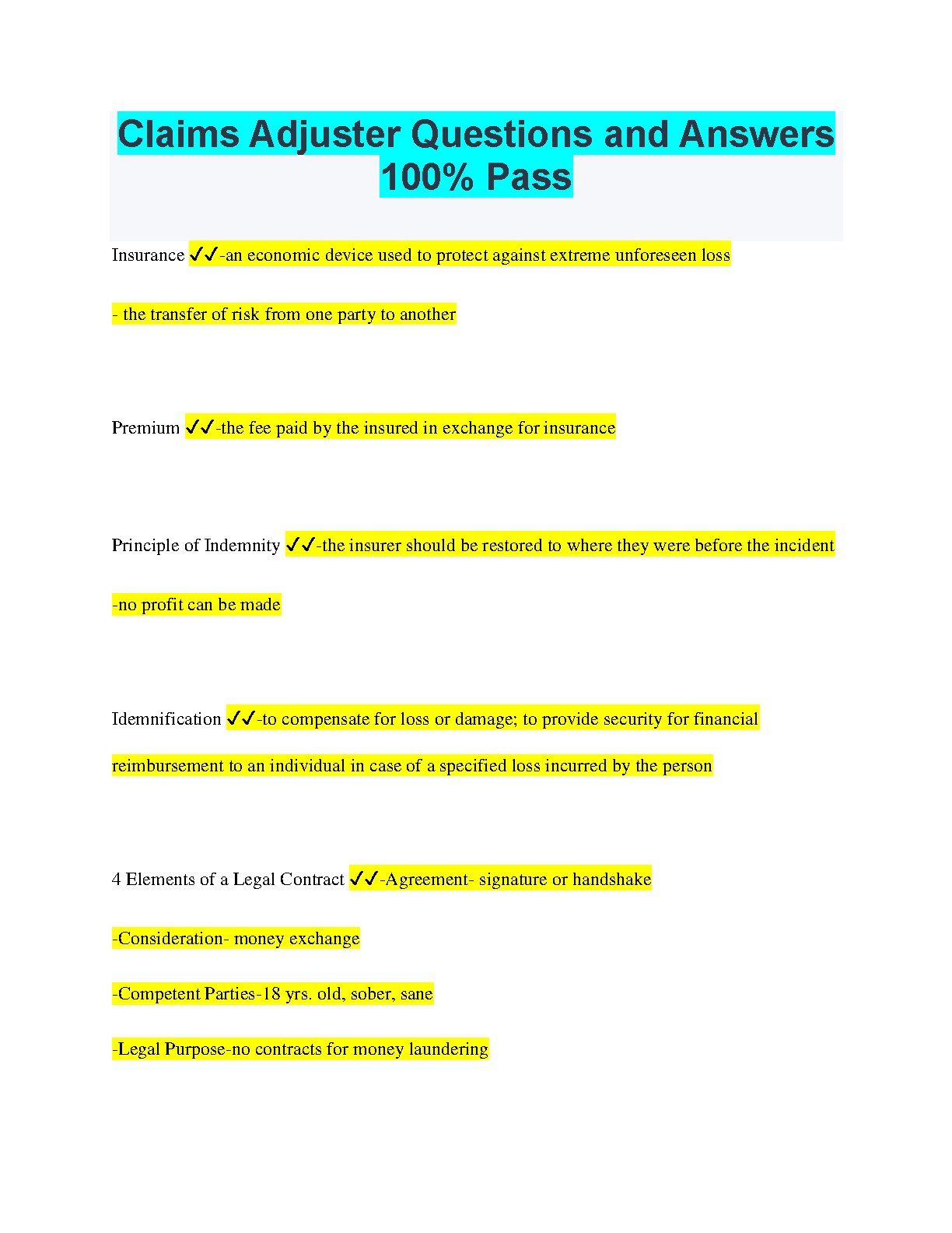 Claims Adjuster Questions and Answers: 100% Pass for 2024/2025 - Ace Your Exams on the First Try and Avoid Resits