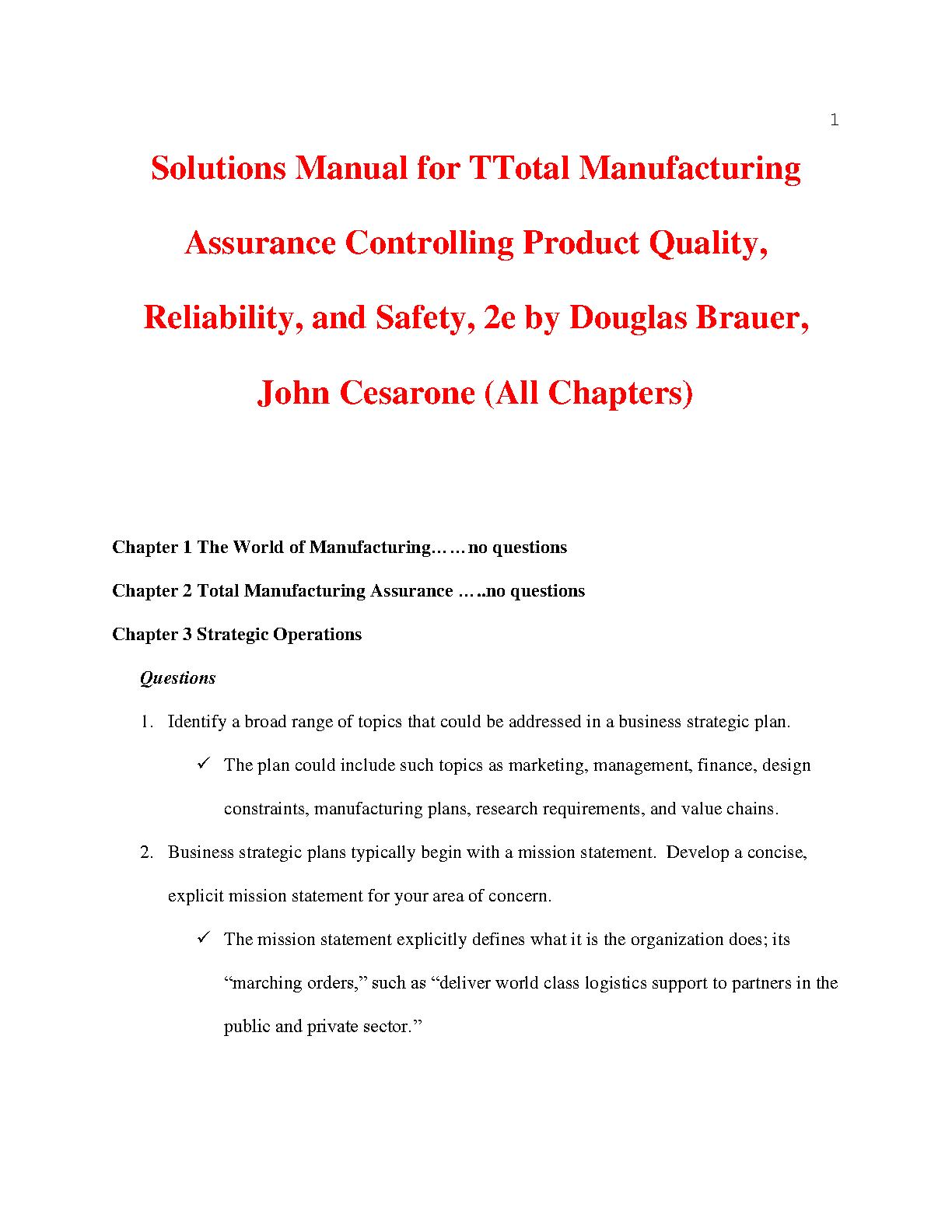 Solutions Manual for Total Manufacturing Assurance Controlling Product Quality, Reliability, and Safety, 2e by Douglas Brauer, John Cesarone (All Chapters)