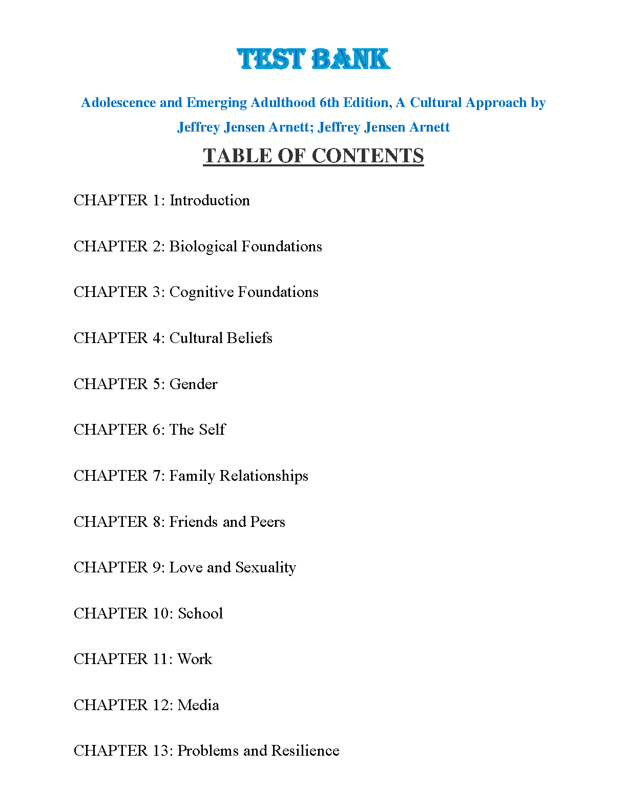Adolescence and Emerging Adulthood: A Cultural Approach, 6th Edition, Test Bank by Jeffrey Jensen Arnett
