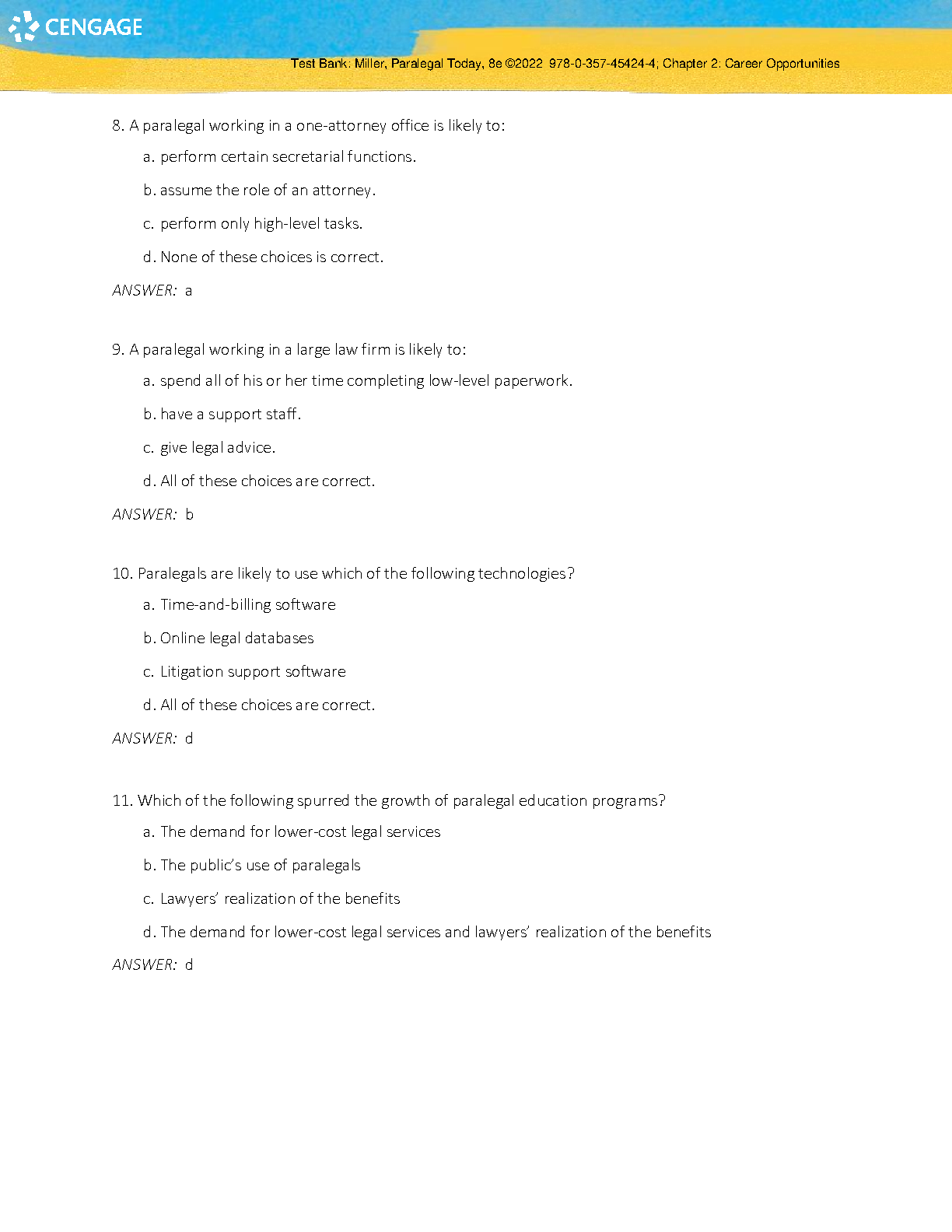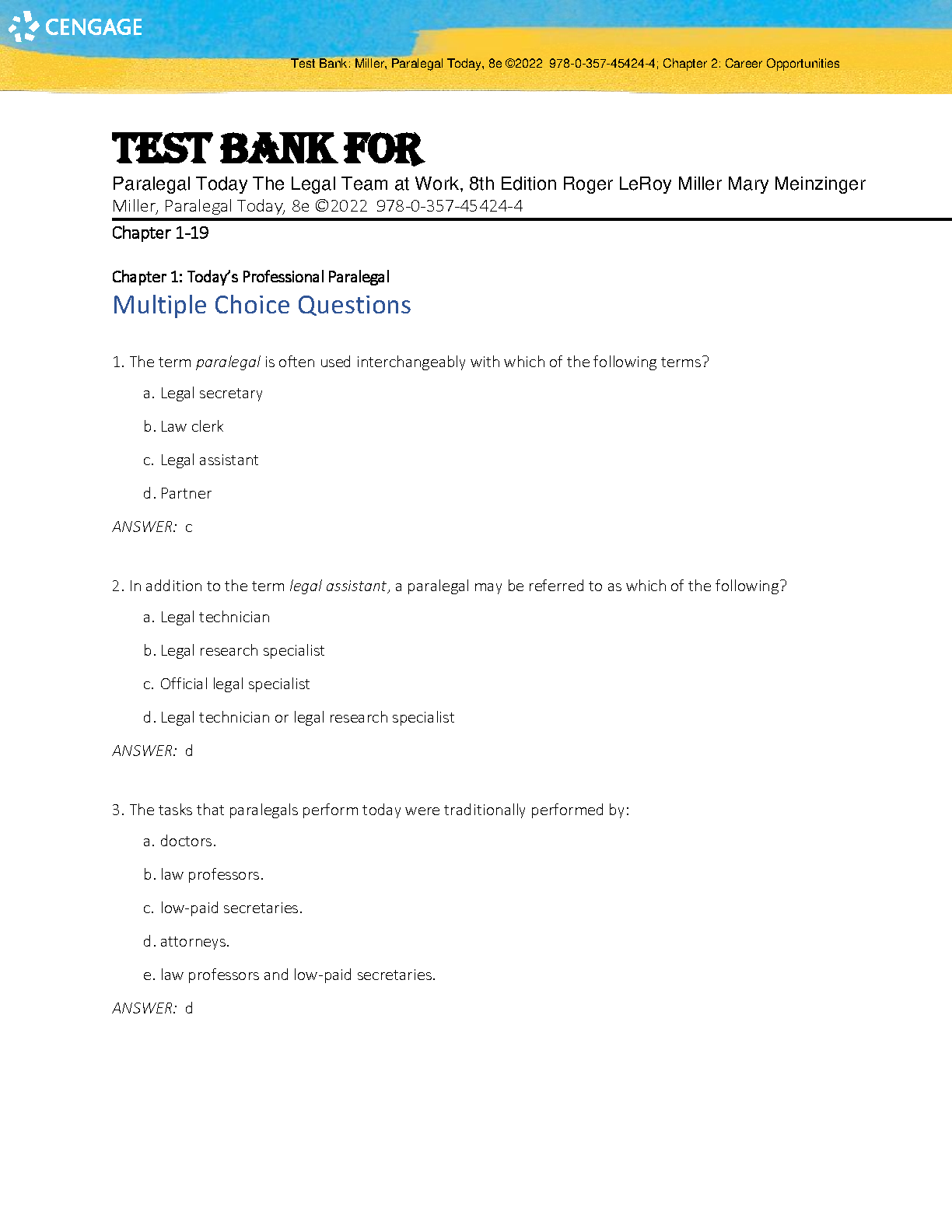 Test Bank for Paralegal Today The Legal Team at Work, 8th Edition Roger LeRoy Miller Mary Meinzinger