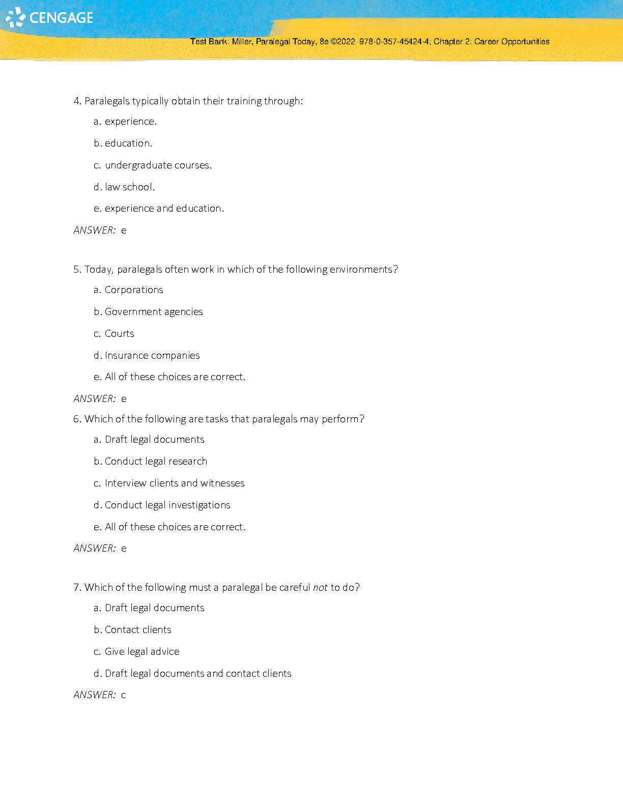 This comprehensive Test Bank for Paralegal Today: The Legal Team at Work, 8th Edition by Roger LeRoy Miller and Mary Meinzinger provides instructors with a valuable resource to assess student understanding of the material. It includes a variety of multiple-choice questions, true/false questions, and essay questions that cover all key concepts and topics discussed in the textbook.