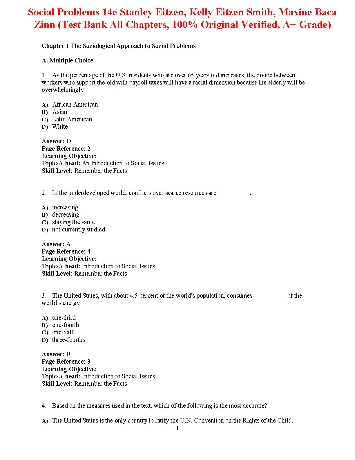 This comprehensive test bank for Social Problems 14th Edition by Stanley Eitzen, Kelly Eitzen Smith, and Maxine Baca Zinn is your key to mastering the course and acing your exams. Packed with a wealth of multiple-choice, true/false, and essay questions, this resource provides a comprehensive review of all chapters, ensuring you're thoroughly prepared for any assessment.