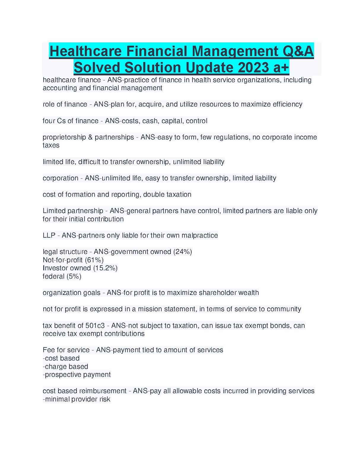 Healthcare Financial Management Q&A Solved Solution Update 2023 a+ by Linda F. Kleeman, PhD, RN, FAAN