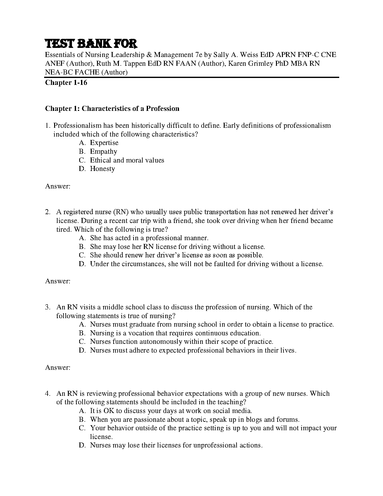 Test Bank for Essentials of Nursing Leadership & Management 7e by Sally A. Weiss EdD APRN FNP-C CNE ANEF (Author), Ruth M. Tappen EdD RN FAAN (Author), Karen Grimley PhD MBA RN NEA-BC FACHE (Author)