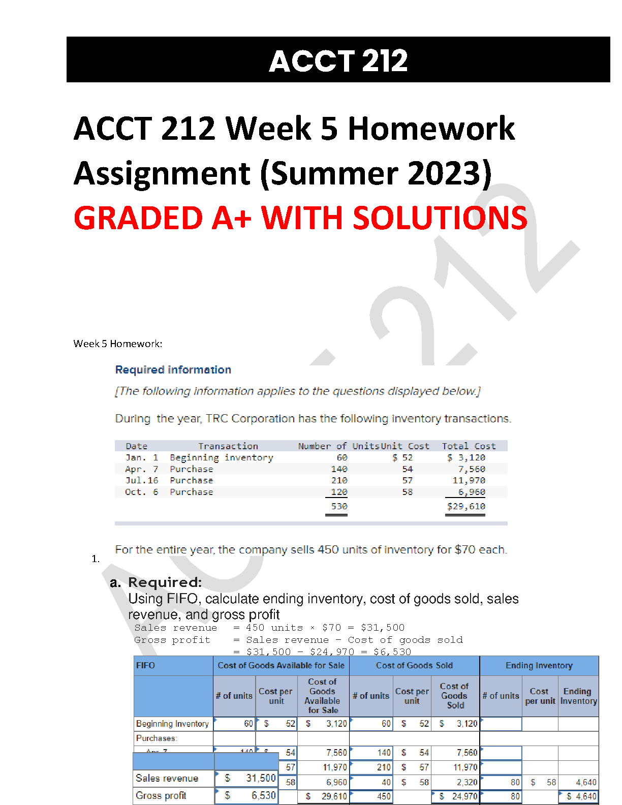 Ace your ACCT 212 course with our meticulously crafted solutions for Week 5 Homework Assignment (Summer 2023). This resource offers step-by-step explanations, ensuring a deep understanding of the concepts and boosting your exam confidence. Get ready to achieve an A+ and avoid resits.