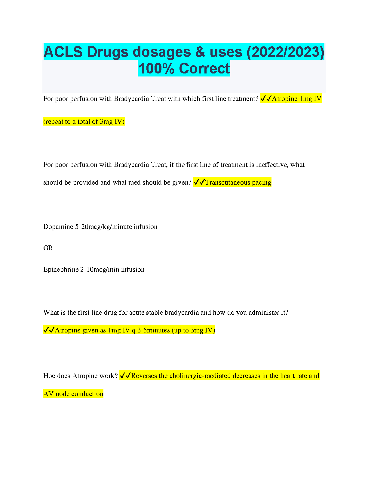 This comprehensive guide provides detailed information on the dosages and uses of ACLS drugs, including Atropine, Dopamine, and Epinephrine, for the 2022/2023 academic year. It also includes a breakdown of the treatment of bradycardia. Students can utilize this resource to improve their understanding and achieve first-attempt exam success, avoiding resits.