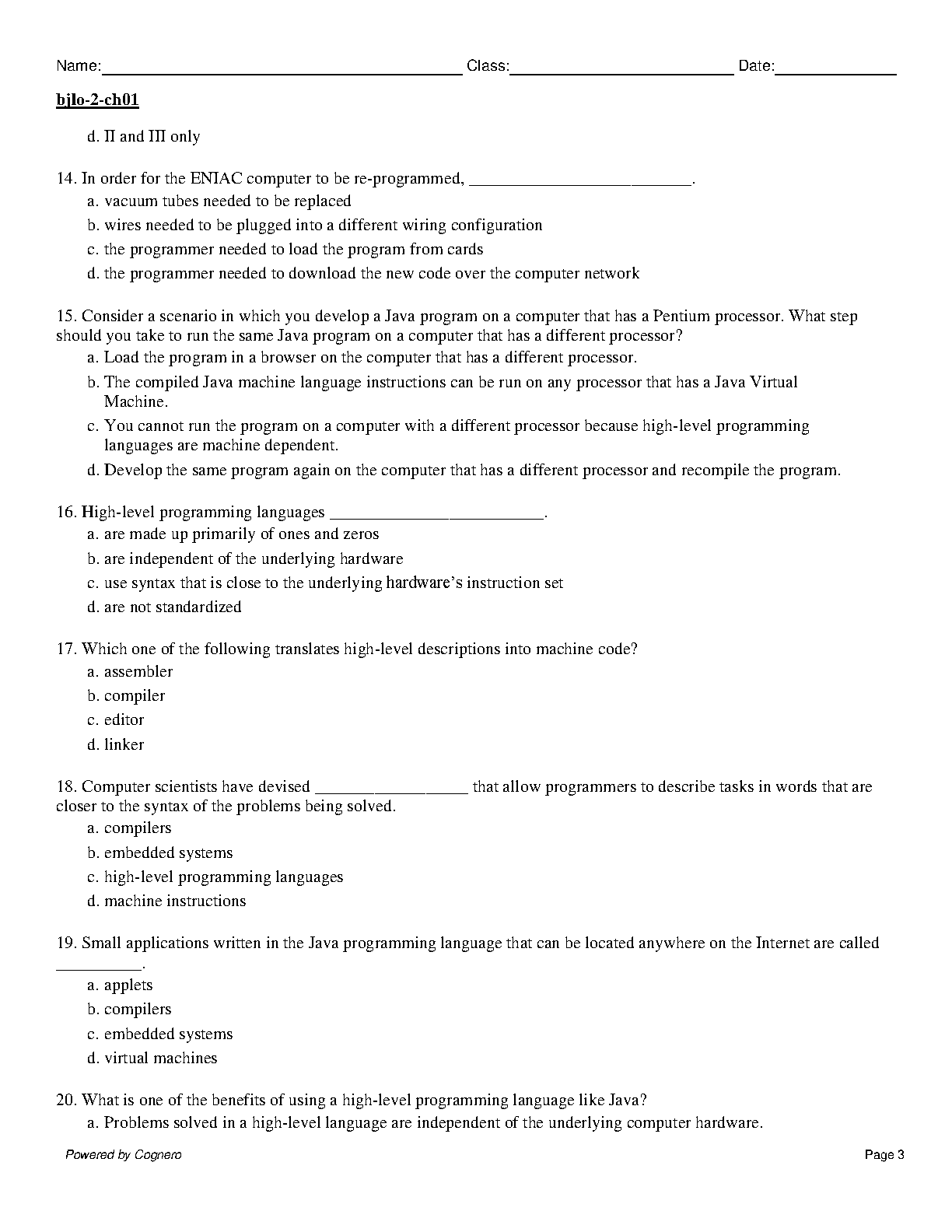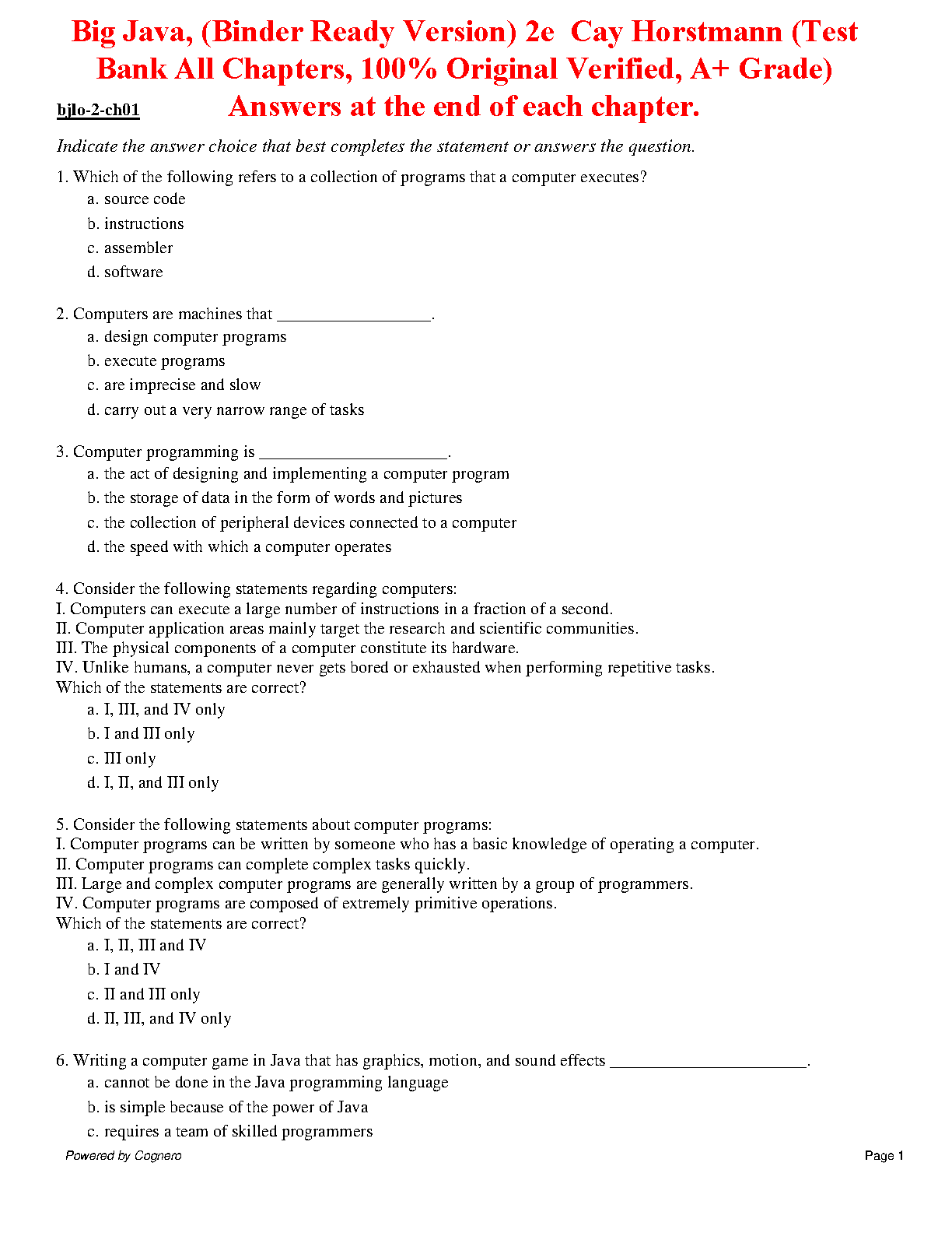 This is a test bank containing all the answers for each chapter of the Big Java (Binder Ready Version) 2e by Cay Horstmann. The test bank was made by a group of students to help you score A+ and make sure you avoid any resit.