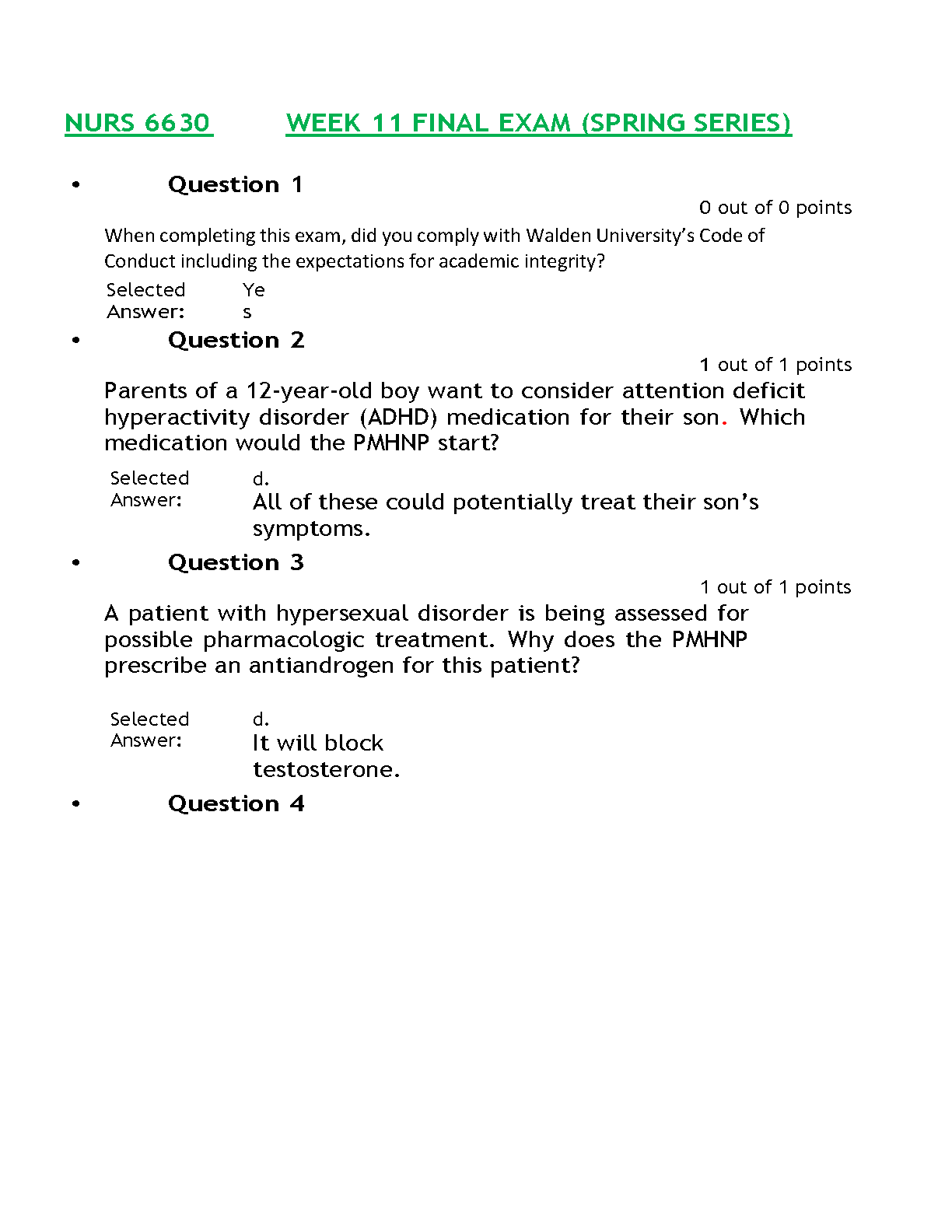 NURS 6630: Week 11 Final Exam (Spring Series) - Practice Questions for Success