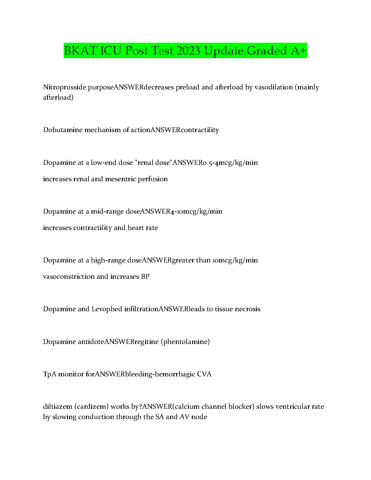 Get the highest score on your BKAT ICU Post Test with this 2023 graded A+ study guide. This comprehensive resource is packed with key concepts, practice questions, and answers to help you master the critical care concepts covered in your ICU Post Test. Achieve your goals and pass with confidence.