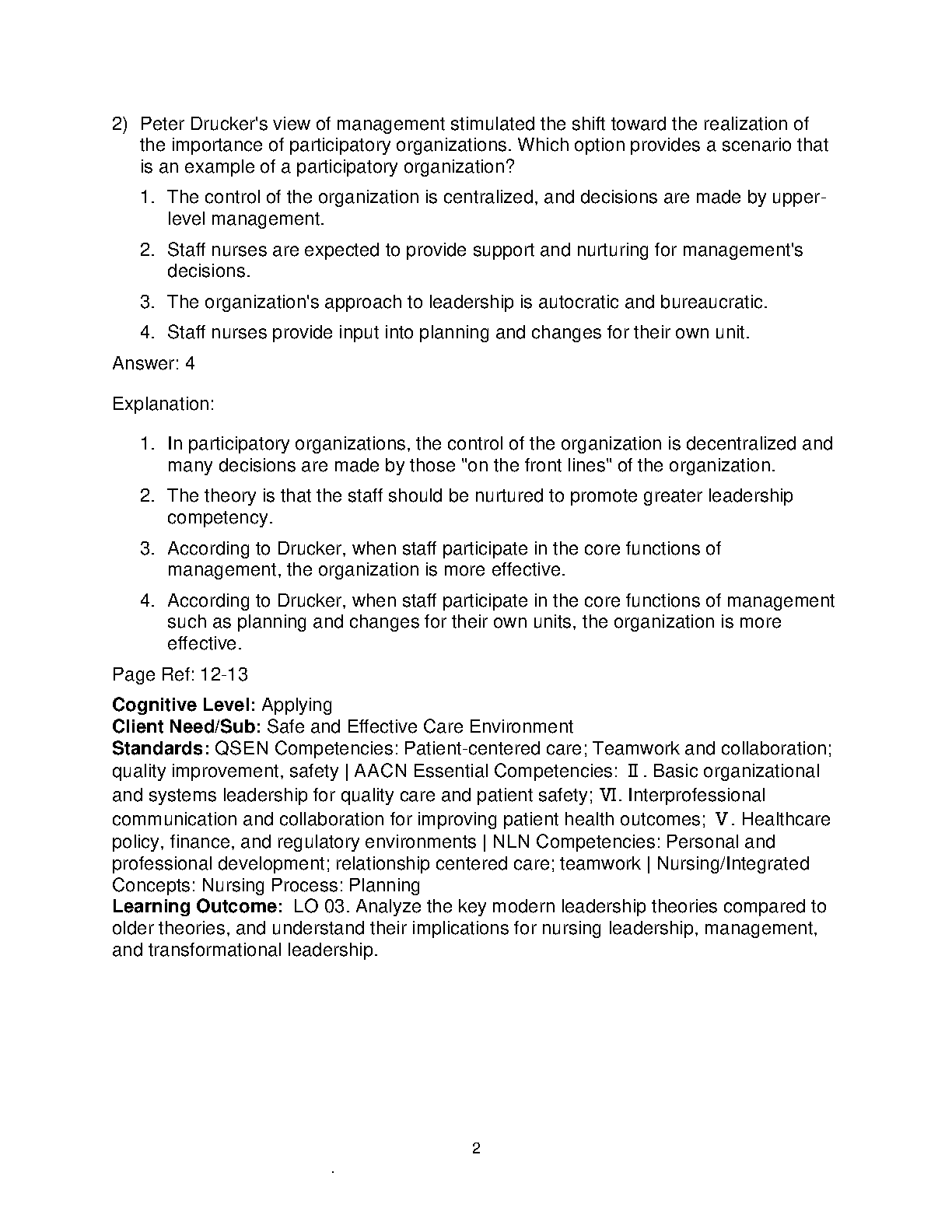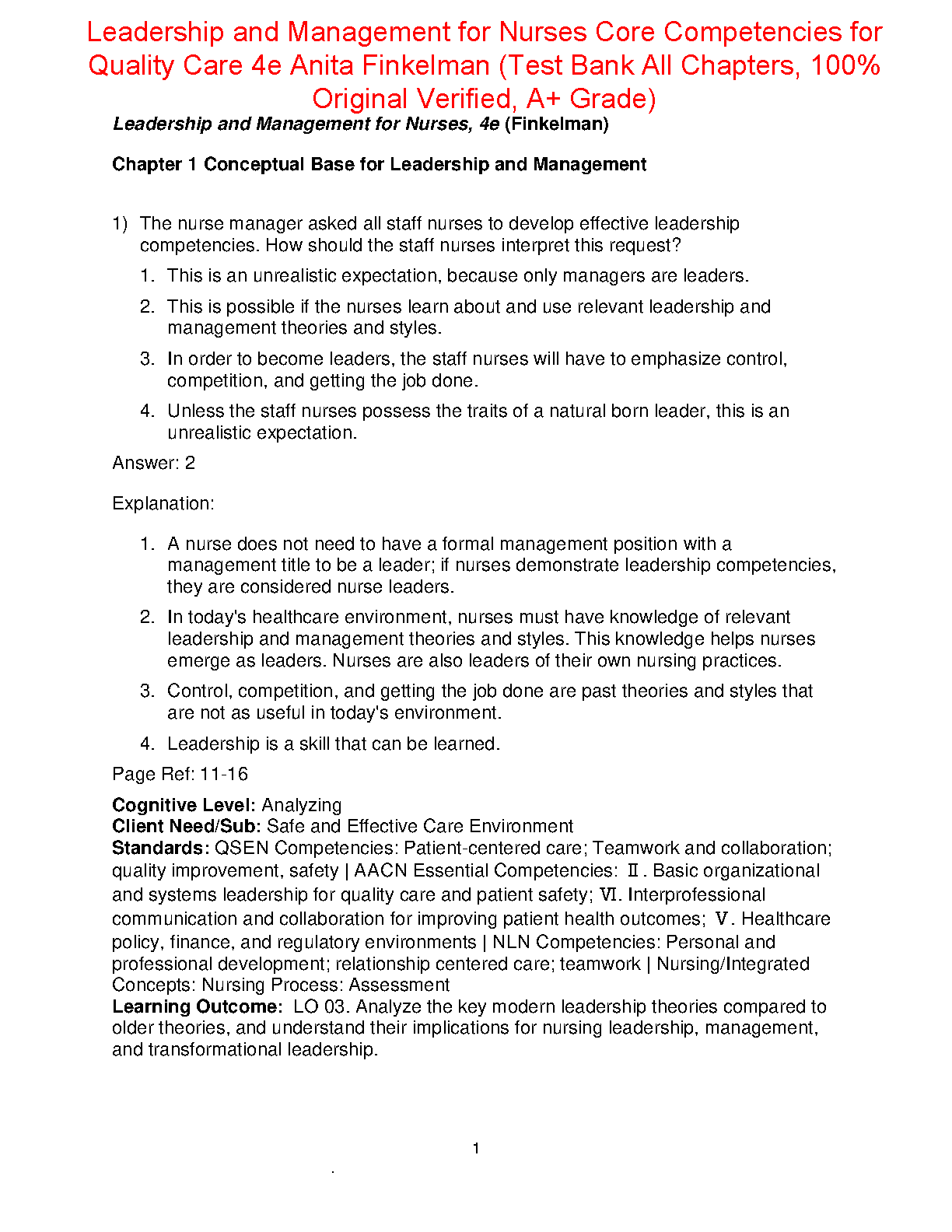 Ace your nursing exams with this comprehensive Test Bank for Leadership and Management for Nurses Core Competencies for Quality Care, 4th Edition by Anita Finkelman. This resource provides a complete set of test questions covering all chapters of the textbook, ensuring you're fully prepared for success.