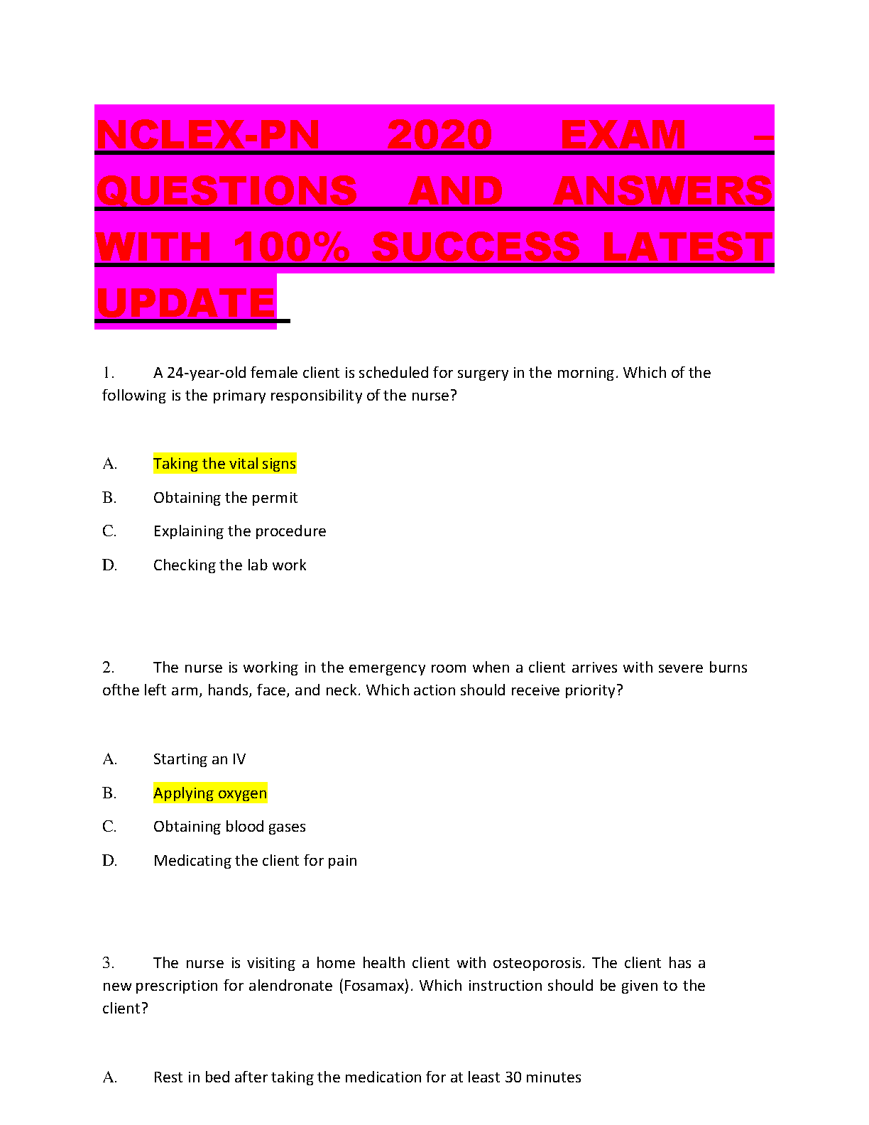 NCLEX-PN 2020 Exam Questions and Answers is designed to help students ace their NCLEX-PN exams on the first attempt. This practice exam will help you understand and review the most important concepts, strengthen your knowledge, and improve your test-taking strategies.