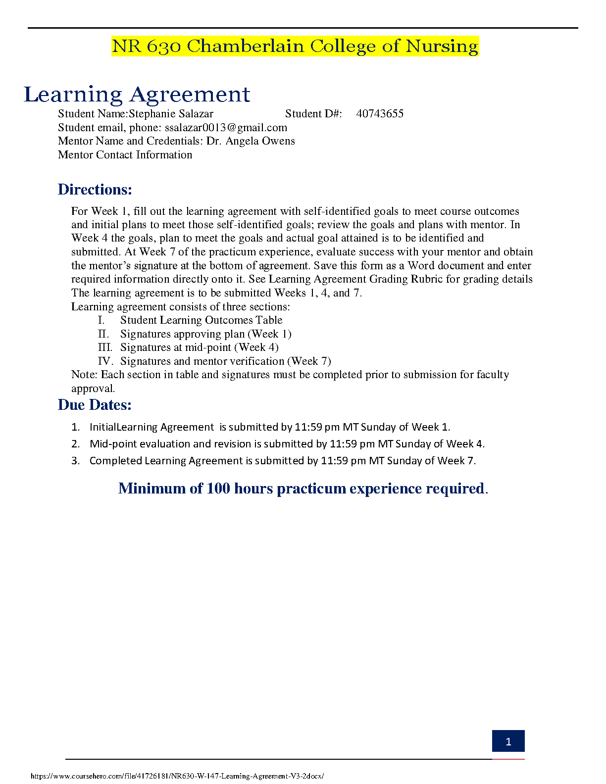 NR 630 Chamberlain College of Nursing Learning Agreement