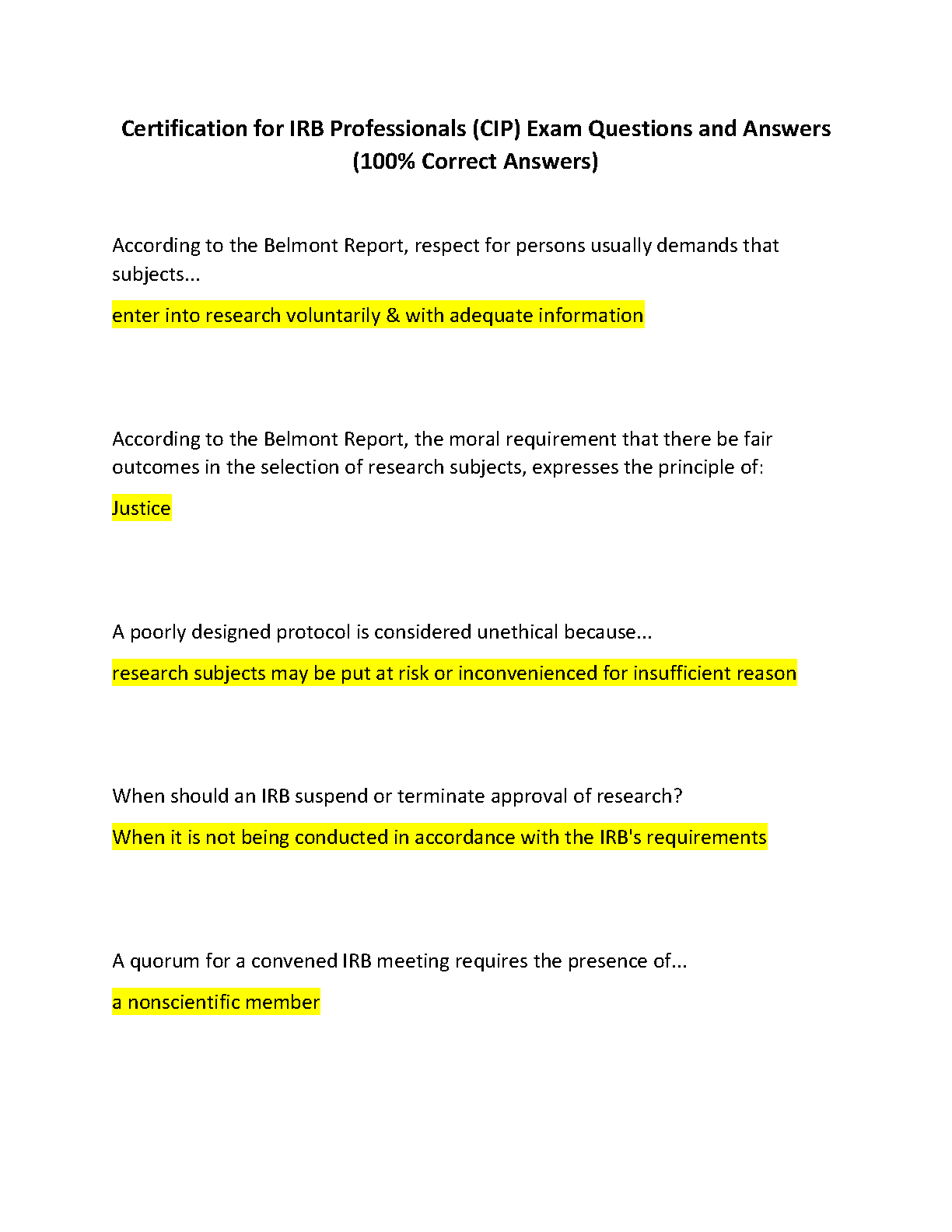 Certification for IRB Professionals (CIP) Exam Questions and Answers (100% Correct Answers)