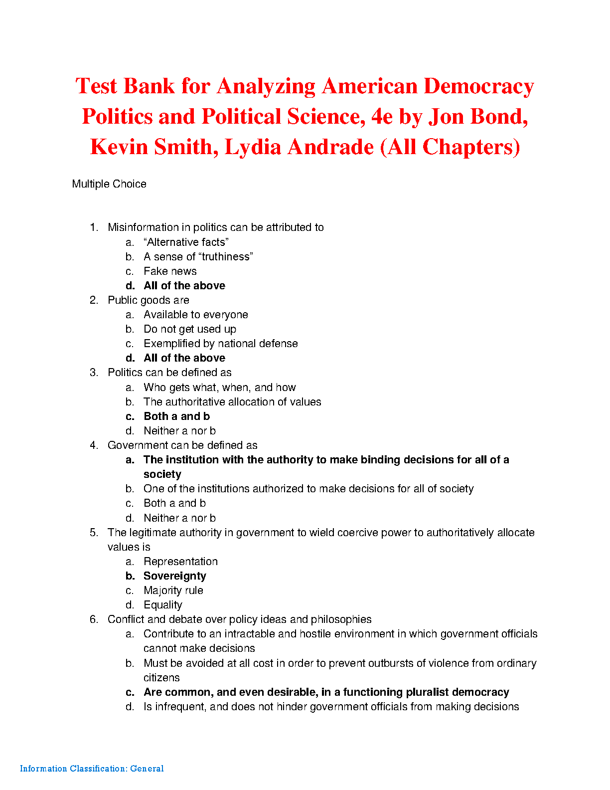 Test Bank for Analyzing American Democracy: Politics and Political Science, 4e by Jon Bond, Kevin Smith, Lydia Andrade (All Chapters)