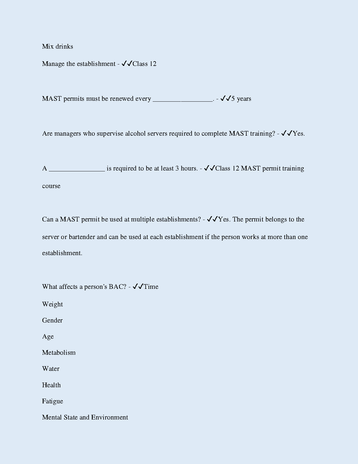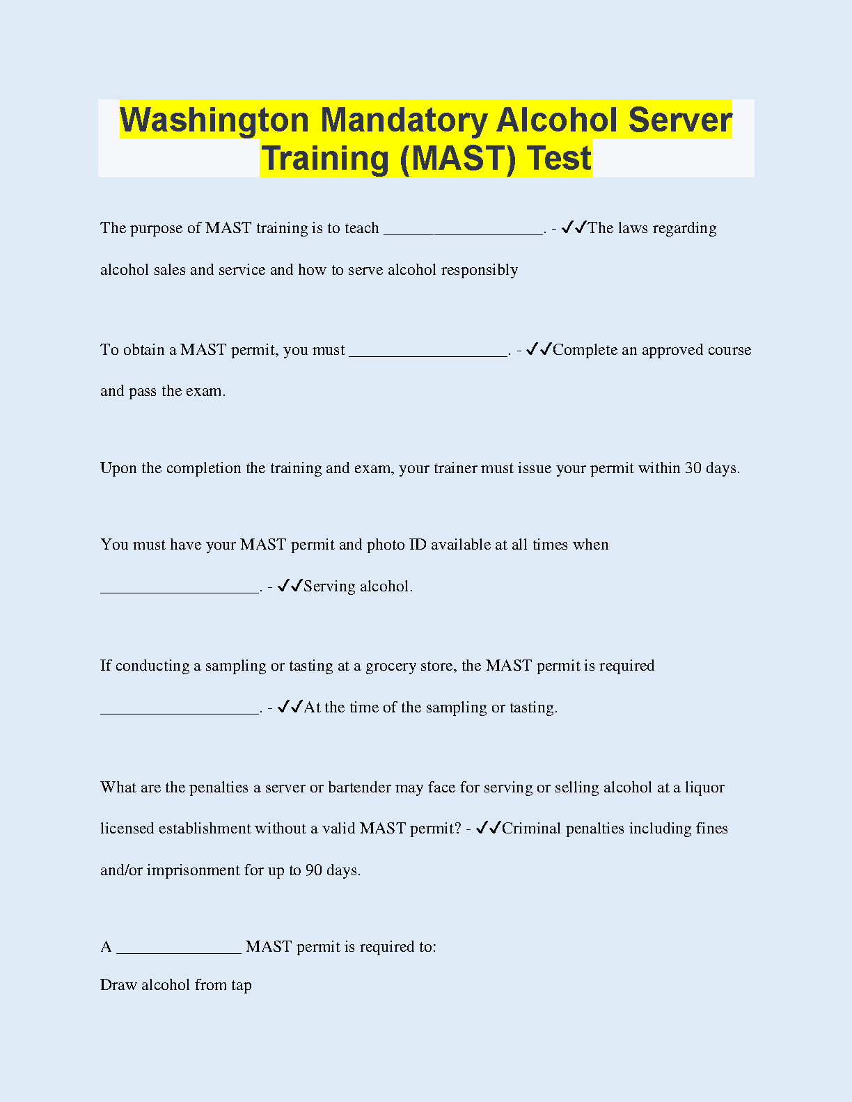 This comprehensive resource provides the necessary knowledge and practice questions to help you master the Washington Mandatory Alcohol Server Training (MAST) Test. Prepare effectively for the exam, ensuring you understand the laws regarding alcohol sales, service, and responsible alcohol consumption. Gain the confidence to pass your exam and obtain your MAST permit on the first attempt.