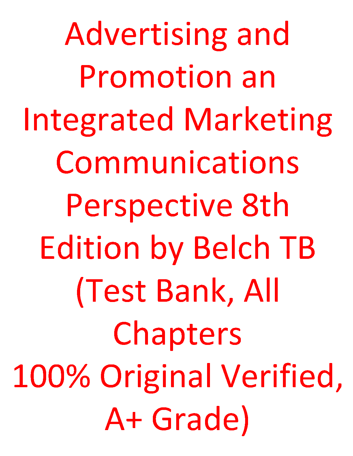 This comprehensive test bank for Advertising and Promotion an Integrated Marketing Communications Perspective 8th Edition by Belch & Belch provides instructors with a valuable tool for assessing student learning. It includes a wide range of questions, covering all chapters of the textbook, designed to test students' knowledge and understanding of key concepts.