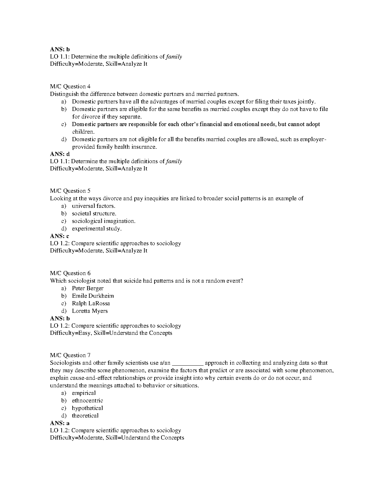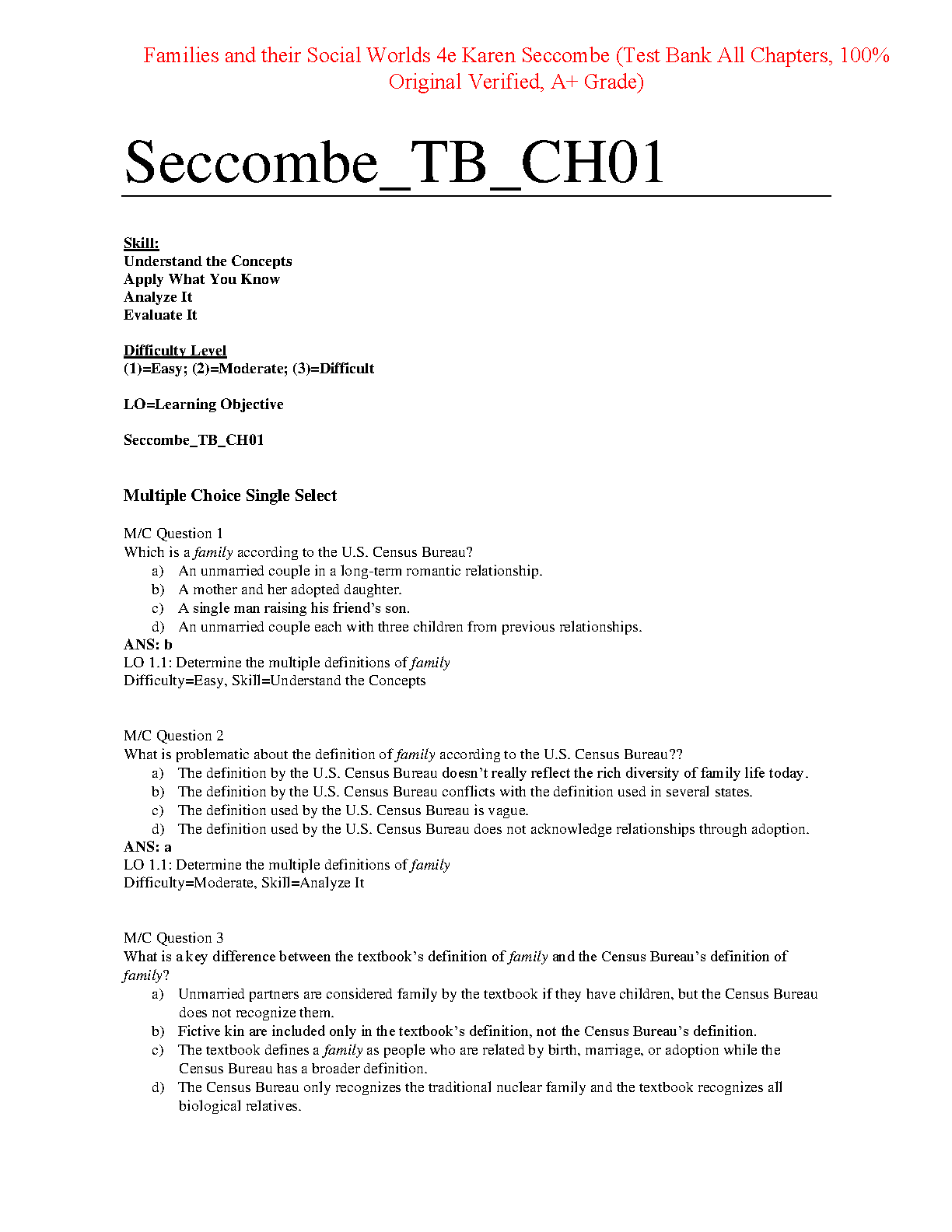 This is a test bank of Families and Their Social Worlds 4th Edition by Karen Seccombe. This comprehensive resource contains answers to all chapters of the book and can help students prepare for exams and achieve higher grades. This resource was developed by top-rated subject matter experts and provides accurate, high-quality content to ensure success in your course.