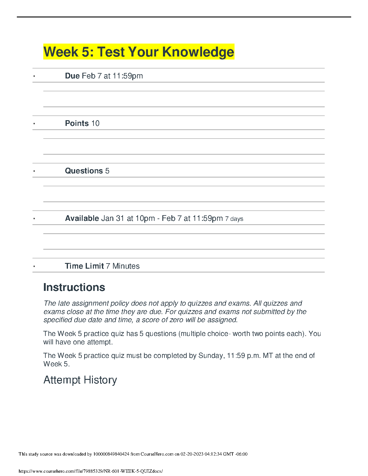 This resource offers a comprehensive quiz for Week 5 of the NR 601 course. It features 5 multiple-choice questions, each worth 2 points, and is designed to help students assess their understanding of the week's material.
