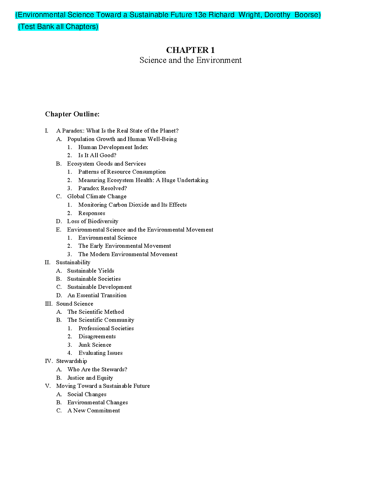 This test bank covers all chapters of Environmental Science Toward a Sustainable Future 13e by Richard Wright and Dorothy Boorse. It contains multiple-choice questions, true/false questions, and short answer questions that are designed to help you assess your understanding of the material.