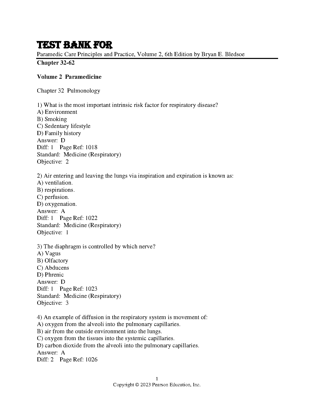 This Test Bank for Paramedic Care Principles and Practice, Volume 2, 6th Edition by Bryan E. Bledsoe, Mary Ann Lewis, James A. O'Neil includes comprehensive multiple-choice questions to test your knowledge of paramedicine. This resource is invaluable for students and professionals looking to prepare for their exams and excel in the field.