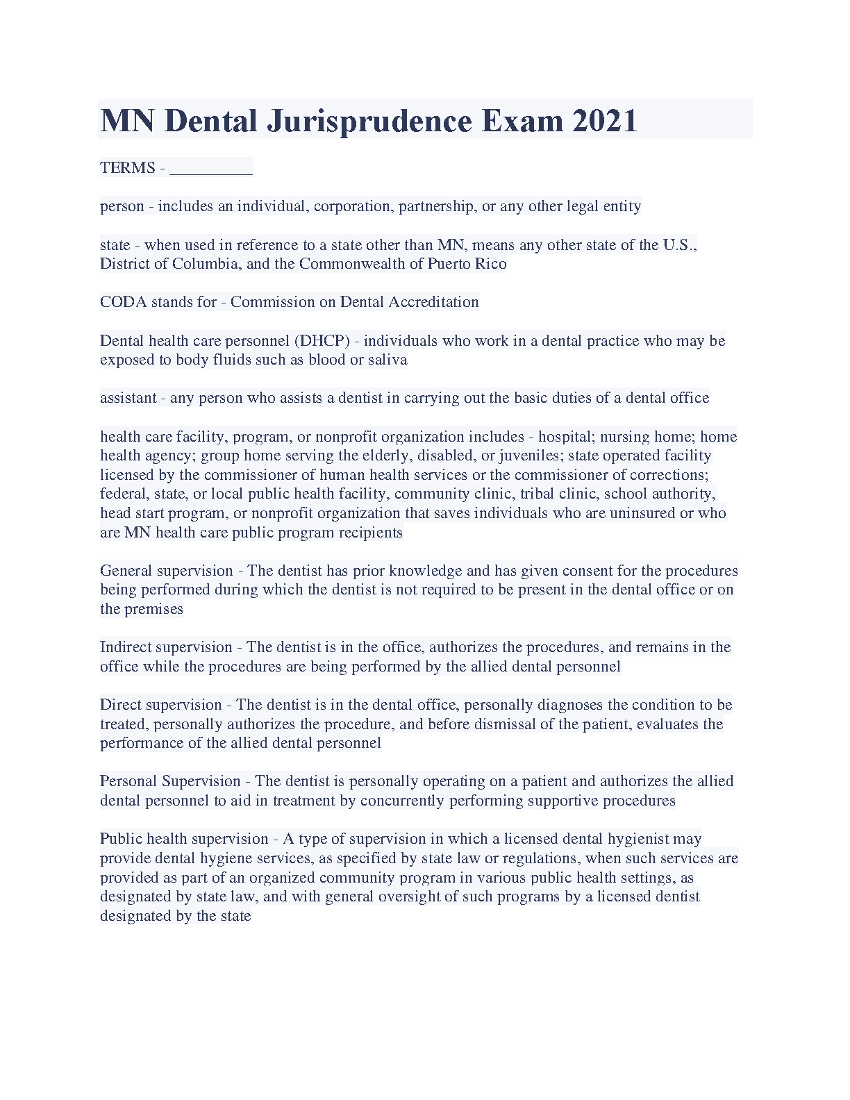 This resource is a comprehensive study guide for the MN Dental Jurisprudence Exam. It covers all the essential topics including terms, dental health care personnel, supervision and public health hygiene services. This guide is perfect for those who want to pass the exam on their first attempt and avoid resits.