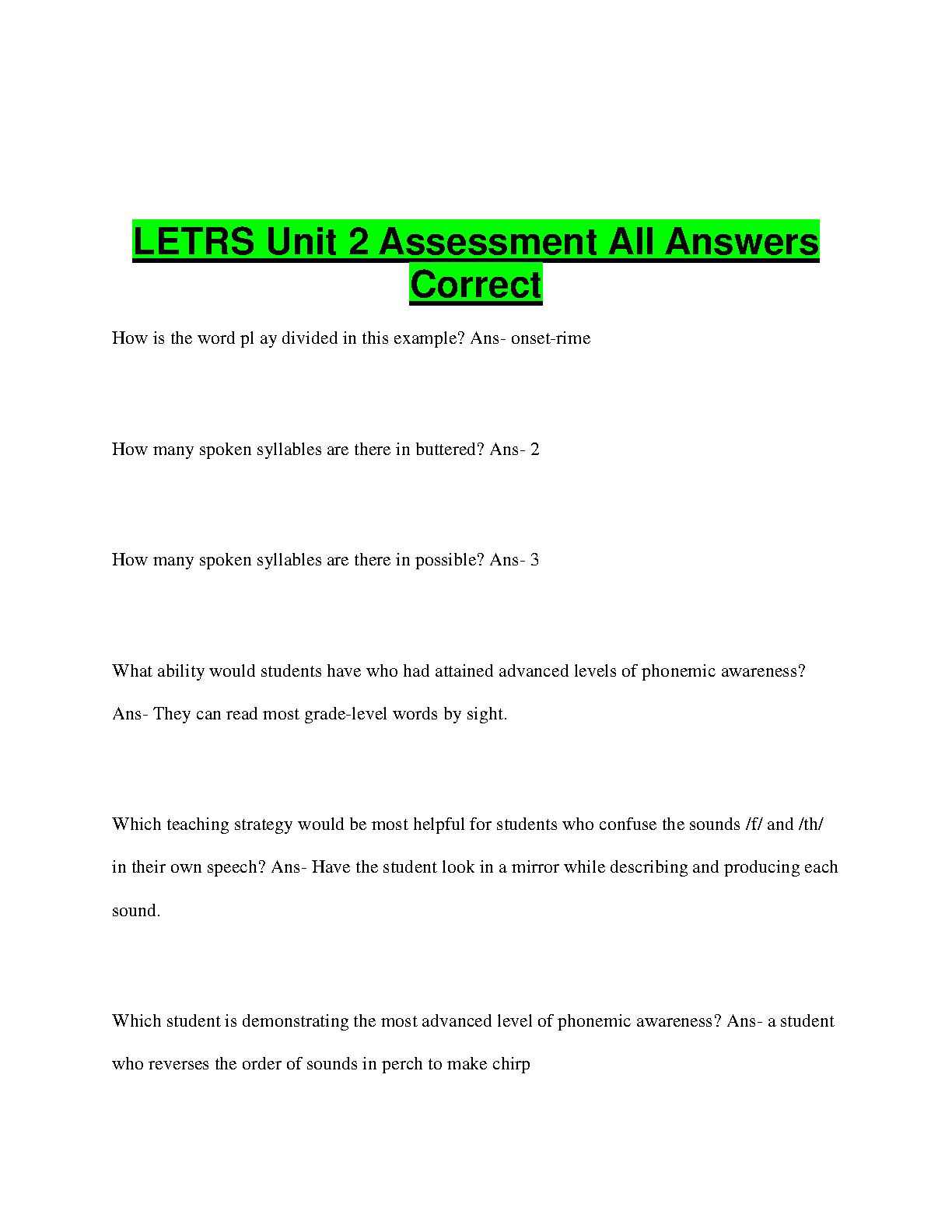 This resource is perfect for students who want to ace their LETRS Unit 2 assessment. It includes all the answers to the assessment questions, so you can be sure you are prepared for your exam. No more resits!