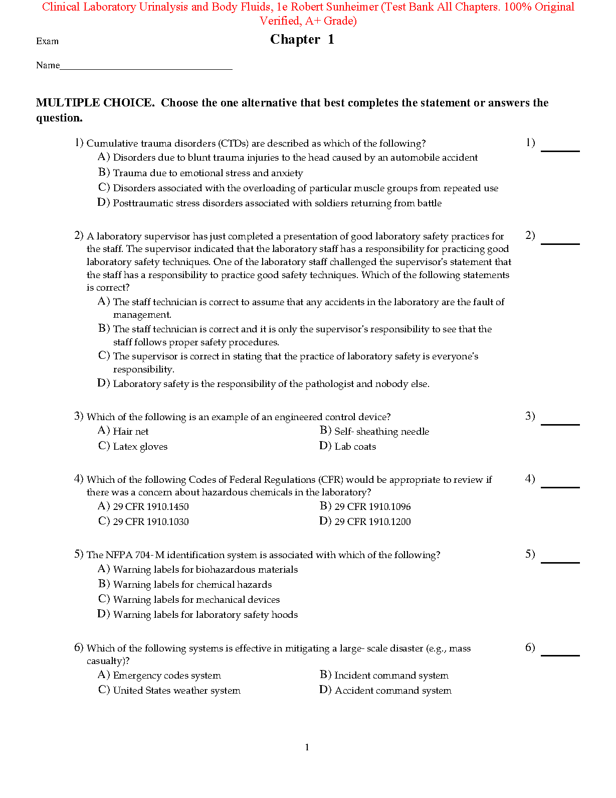Clinical Laboratory Urinalysis and Body Fluids, 1e Robert Sunheimer (Test Bank All Chapters. 100% Original Verified, A+ Grade)