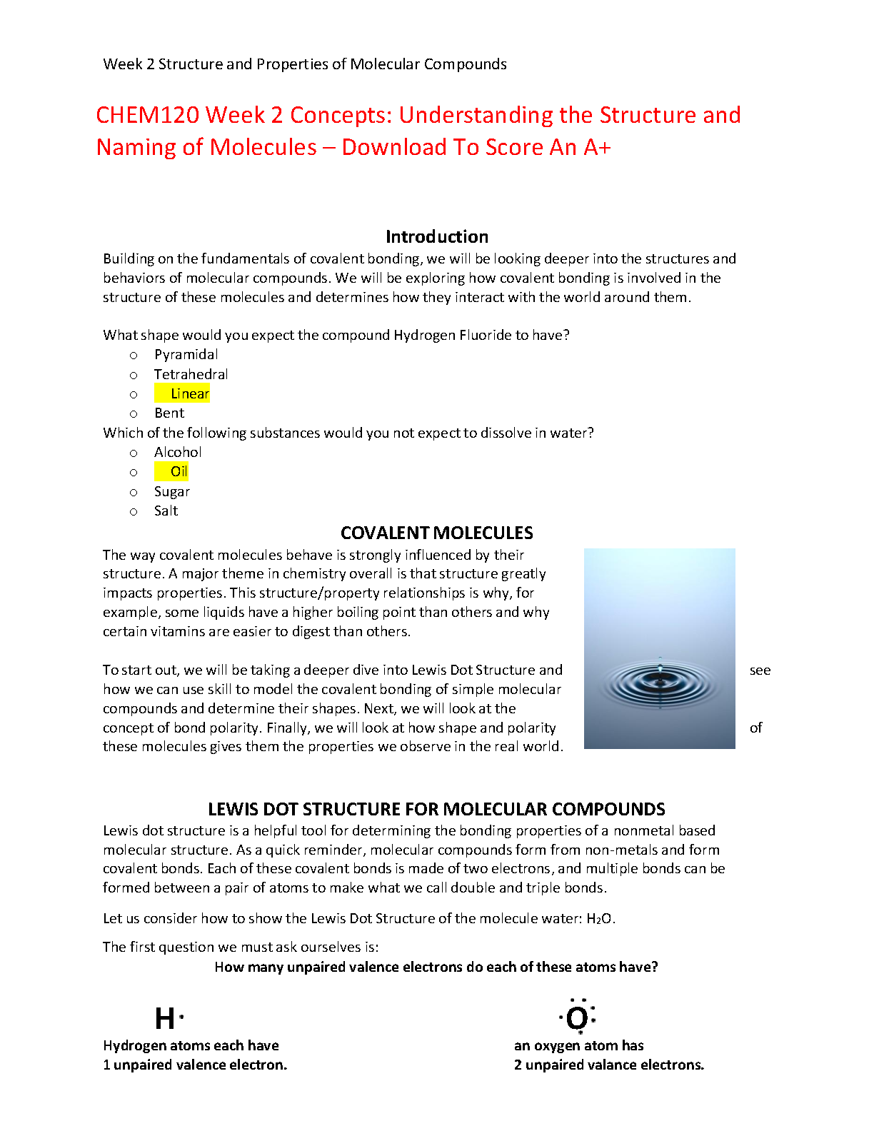 CHEM120 Week 2 Concepts: Understanding the Structure and Naming of Molecules - Download to Score An A+ for 2024/2025