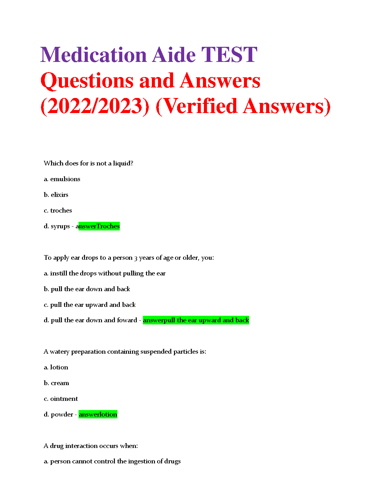 Medication Aide Test Questions and Answers (2022/2023) (Verified Answers) - Ace Your Exam on the First Attempt!