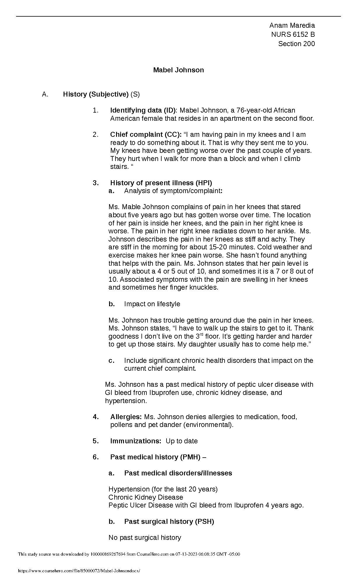 This comprehensive NCLEX-RN case study features the real-life case of Mabel Johnson, a 76-year-old African American female. The case explores her history of present illness, including her pain in her knees, impact on lifestyle, and medical history. This study is essential for NCLEX-RN test preparation, helping you to understand the clinical reasoning and critical thinking skills required to provide safe and effective nursing care.