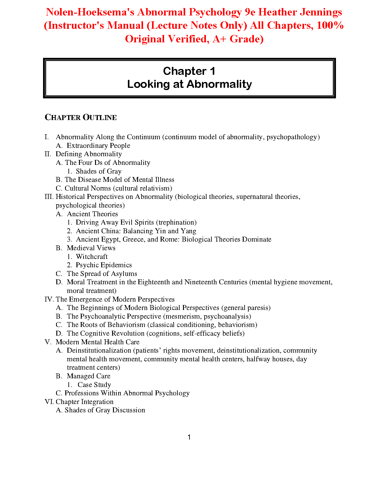 Abnormal Psychology 9e Heather Jennings, Nolen-Hoeksema's (Instructor's Manual Lecture Notes Only) All Chapters, 100% Original Verified, A+ Grade