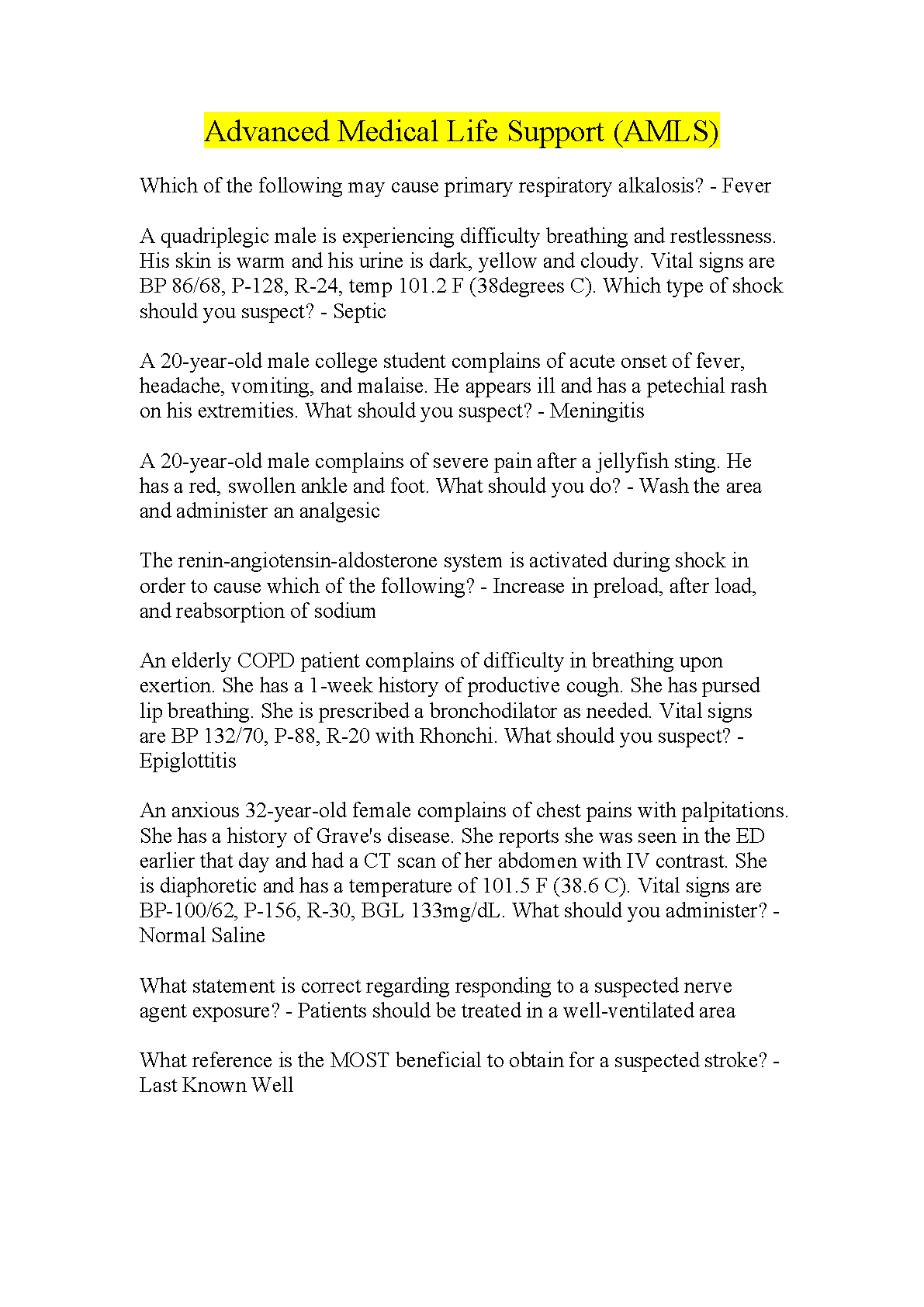 Prepare for your Advanced Medical Life Support (AMLS) exam with confidence! This resource is designed to help you master the essential concepts and skills needed to succeed on your first attempt. With detailed explanations, practice questions, and comprehensive coverage of AMLS topics, you'll be well-equipped to tackle the exam with ease.
