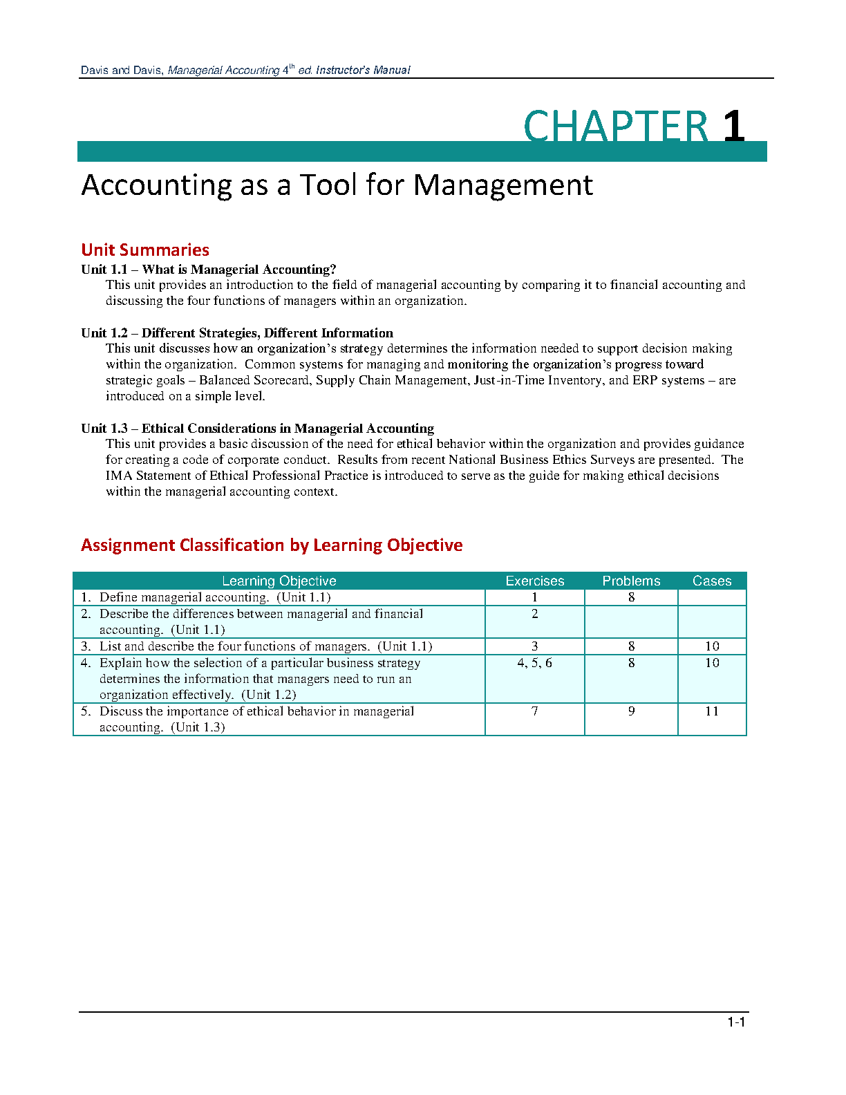 Ace your managerial accounting course with the latest 2024/2025 edition of Davis and Davis's Instructor's Manual. This comprehensive resource is designed to help students understand the fundamentals of managerial accounting and excel in their studies, maximizing their chances of passing their exams on the first attempt. This updated edition covers all the essential topics and learning objectives, providing a structured and engaging approach to learning.