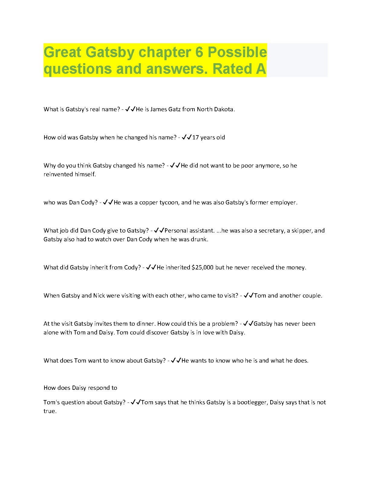 Great Gatsby Chapter 6 Possible Questions and Answers - F. Scott Fitzgerald, - Exam Preparation